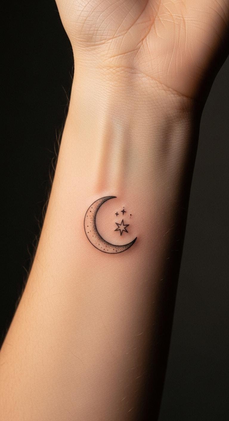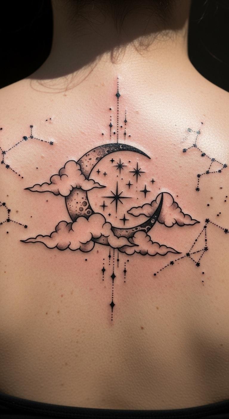 This tattoo design symbolizes the beauty of the night sky and the infinite possibilities of the universe. The crescent moon represents intuition and inner wisdom, while the stars signify hope and guidance on one’s journey.