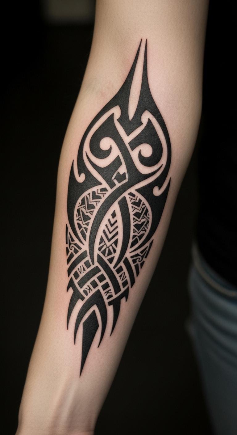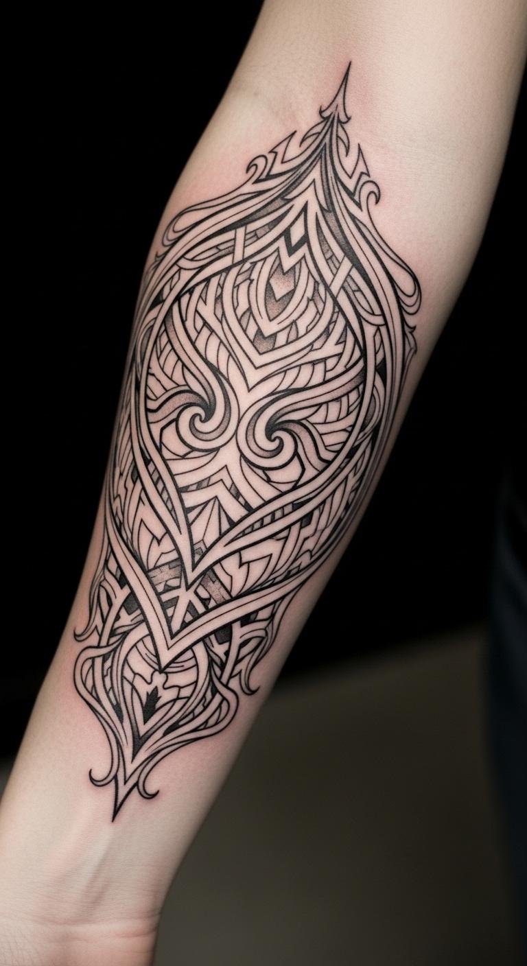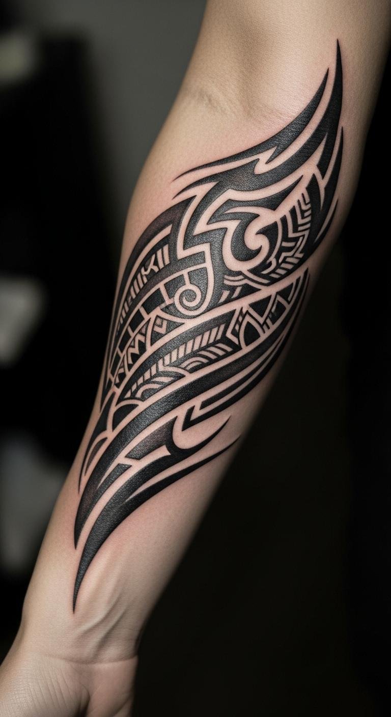 Positioned on the forearm, it allows for visibility and self-expression, inviting conversation and admiration. The flowing lines represent freedom and creativity, while the tribal patterns pay homage to cultural roots, making it a striking statement piece that goes beyond conventional body art.