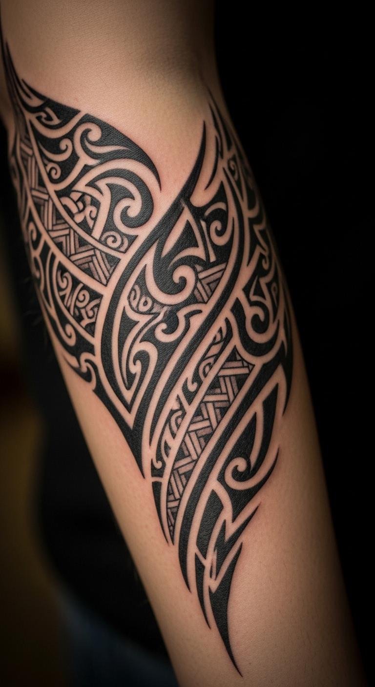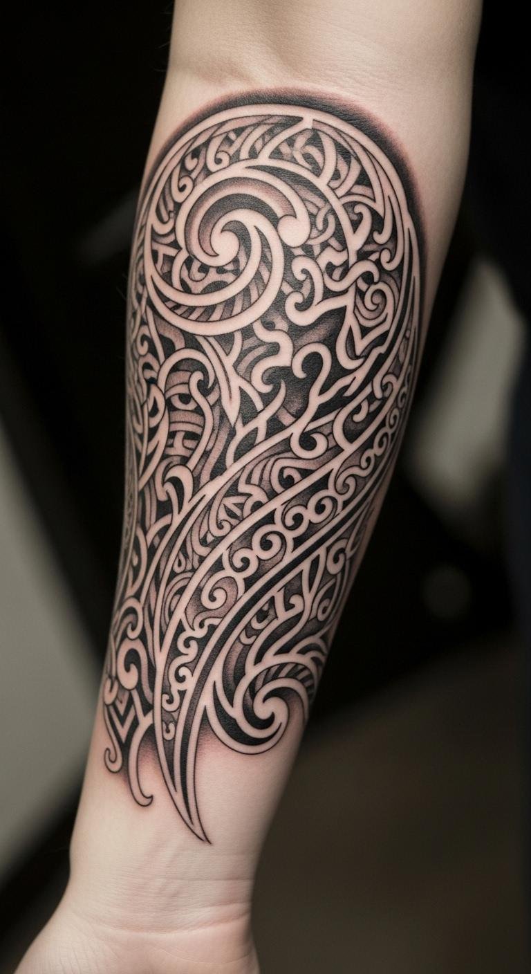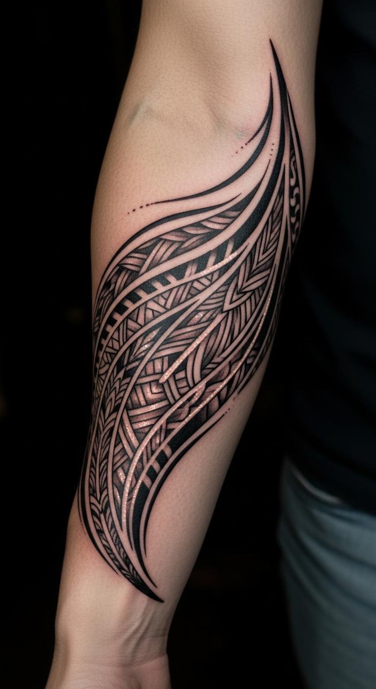 Positioned on the forearm, it allows for visibility and self-expression, inviting conversation and admiration. The flowing lines represent freedom and creativity, while the tribal patterns pay homage to cultural roots, making it a striking statement piece that goes beyond conventional body art.