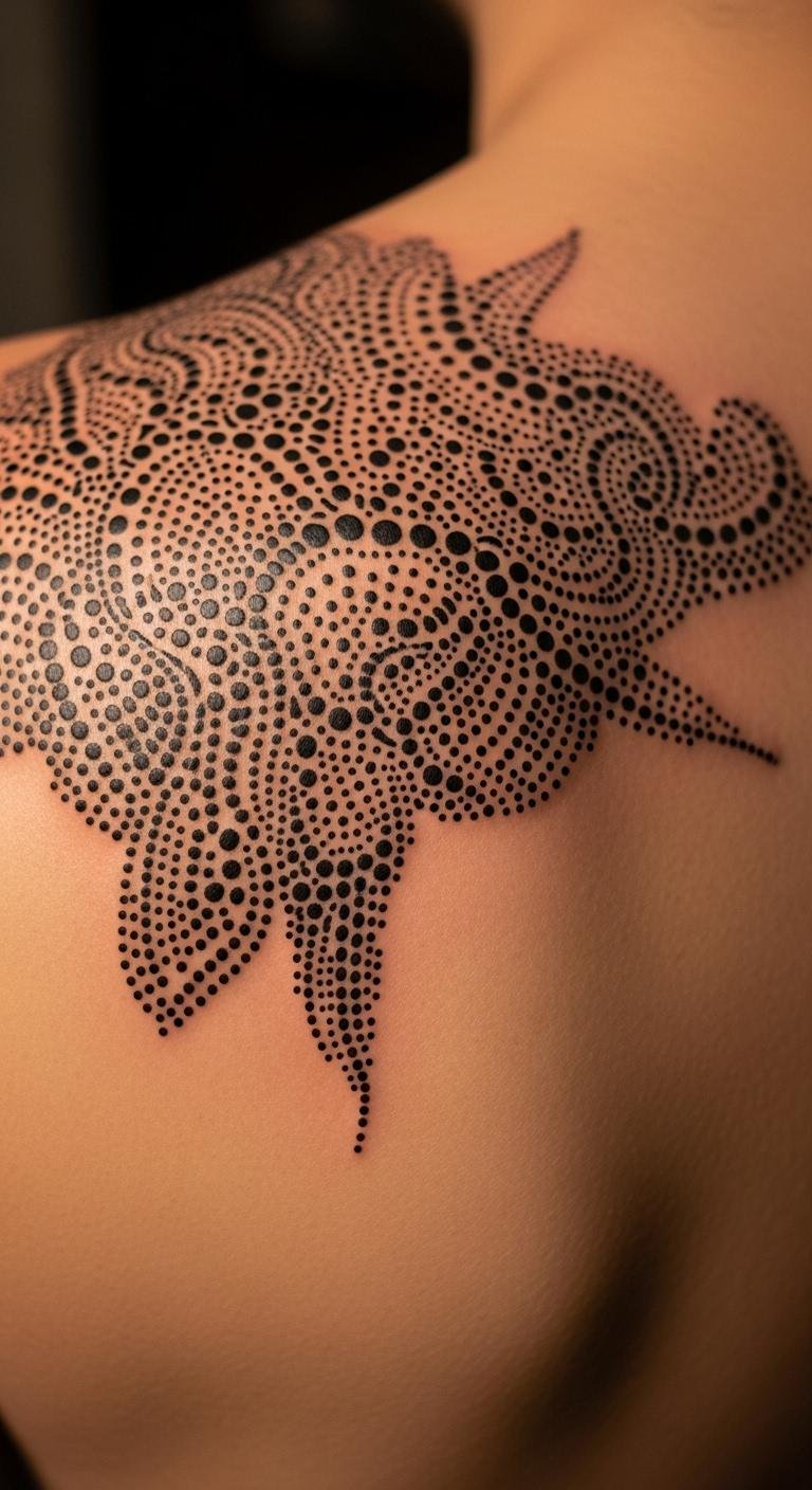 The ethereal quality of the dotwork invites admiration and curiosity, making it a captivating focal point that embodies both beauty and depth.