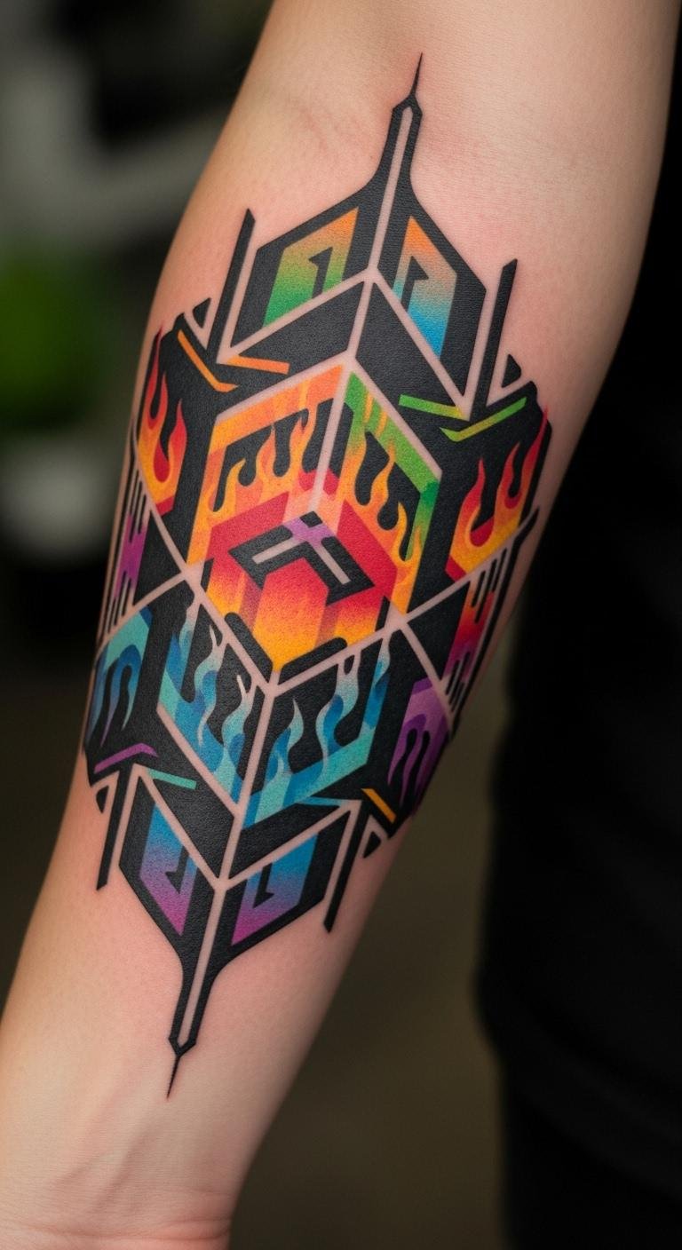 This striking geometric design symbolizes strength and individuality, representing the wearer’s unique identity. Positioned along the forearm, the tattoo is not only visible but also serves as a conversation starter, inviting curiosity and admiration. The choice of placement reflects a bold personality, embracing creativity and daring expression while enhancing personal style in a way that stands out beautifully.