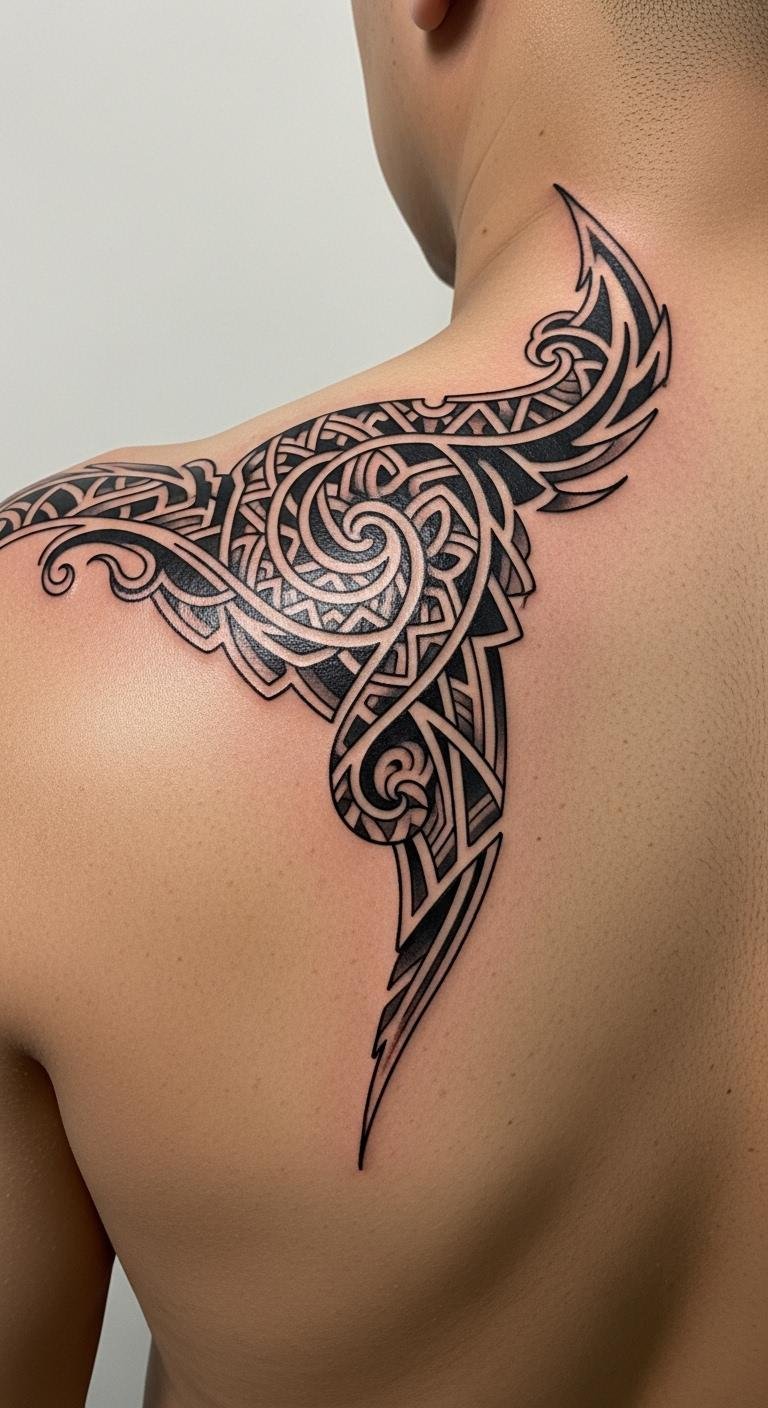 The bold tribal symbols represent strength and connection to ancestral roots, while the intricate patterns reflect a rich tapestry of personal stories and identity.