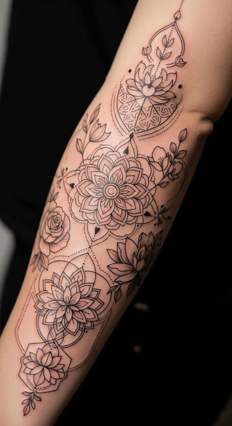 This tattoo design symbolizes the balance between strength and fragility, where the geometric patterns represent stability and structure, while the floral motifs embody growth and beauty.
