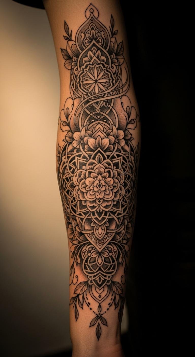 The bold blackwork signifies strength, while the fine lines reflect attention to detail and creativity.
