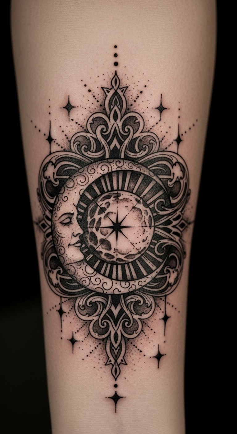 This tattoo embodies the mysteries of the universe and the allure of celestial dreams, serving as a constant reminder of the cosmic balance and navigation that guide us.