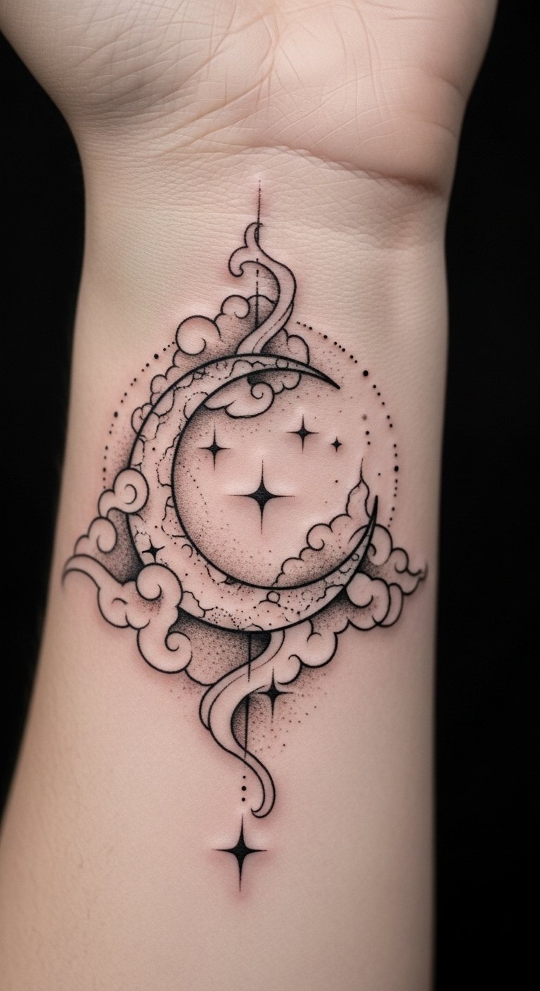 This tattoo on the wrist symbolizes a personal journey towards self-discovery and transformation, embodying the mystical qualities of the moon.