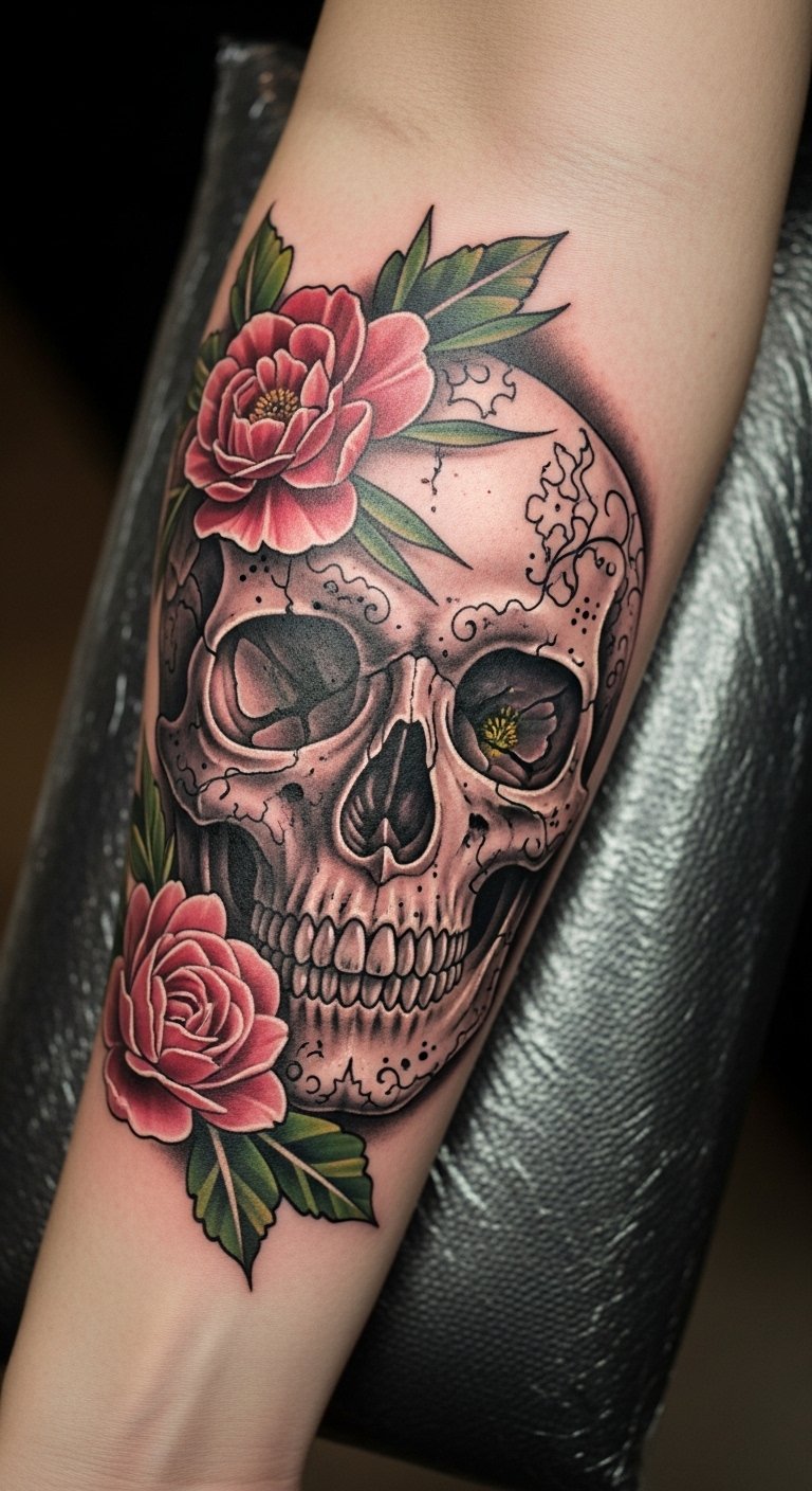 This tattoo symbolizes the delicate balance between life and death, with the skull representing mortality while the flowers signify life and rebirth.