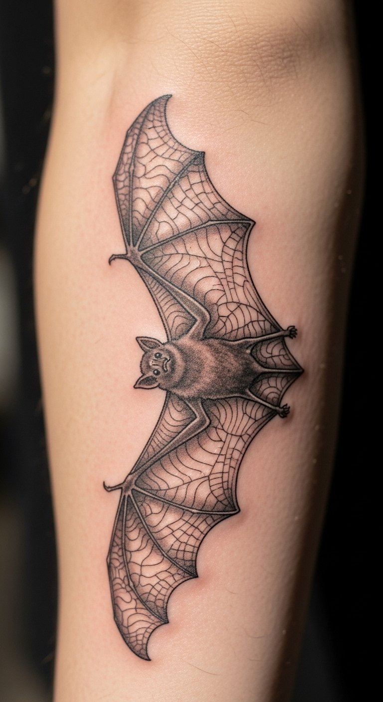 Embodying the essence of mystery and transformation, this bat tattoo on the forearm serves as a powerful reminder of the beauty found in the shadows.