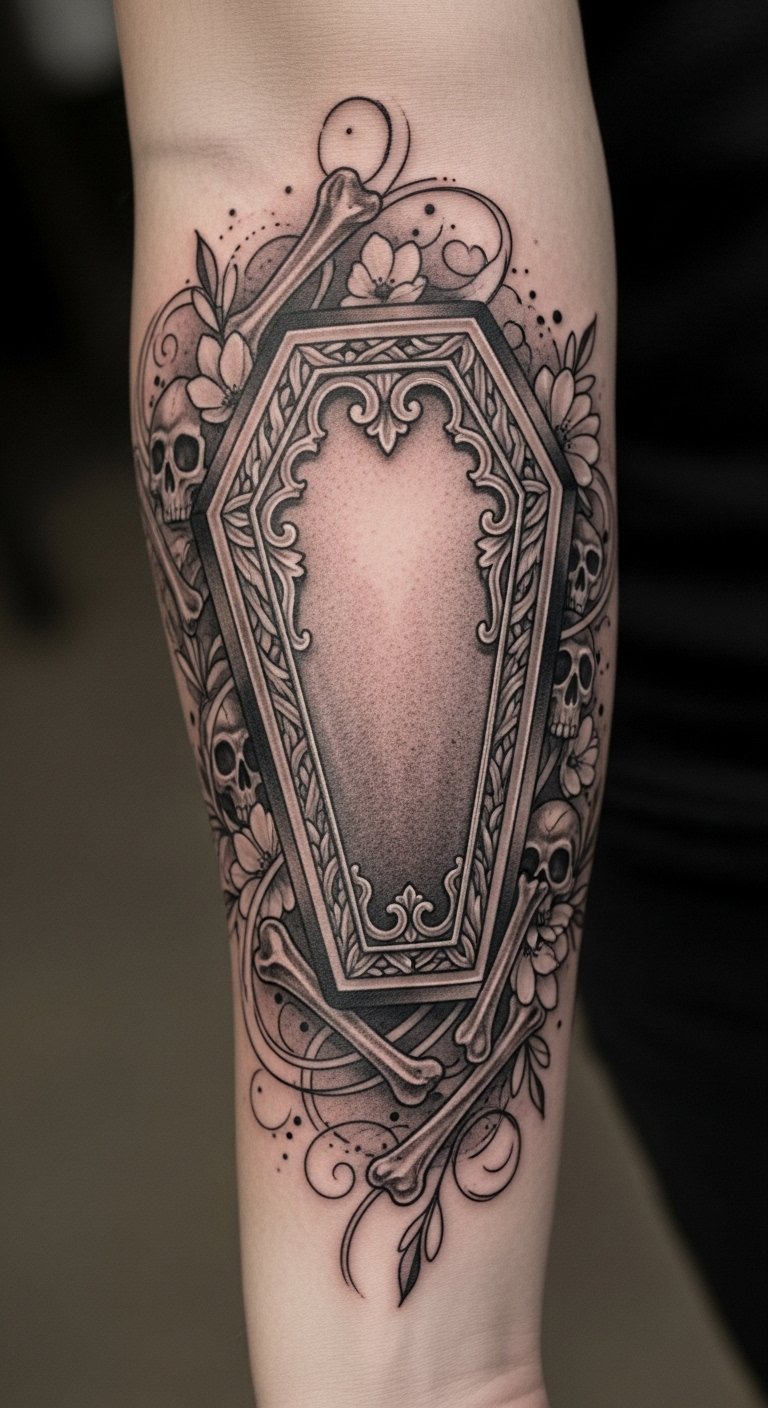 The intricate details of the coffin and bones highlight the fragility of life, evoking a sense of haunting allure that resonates with the wearer and those who see it, ultimately celebrating the enigmatic beauty of existence.