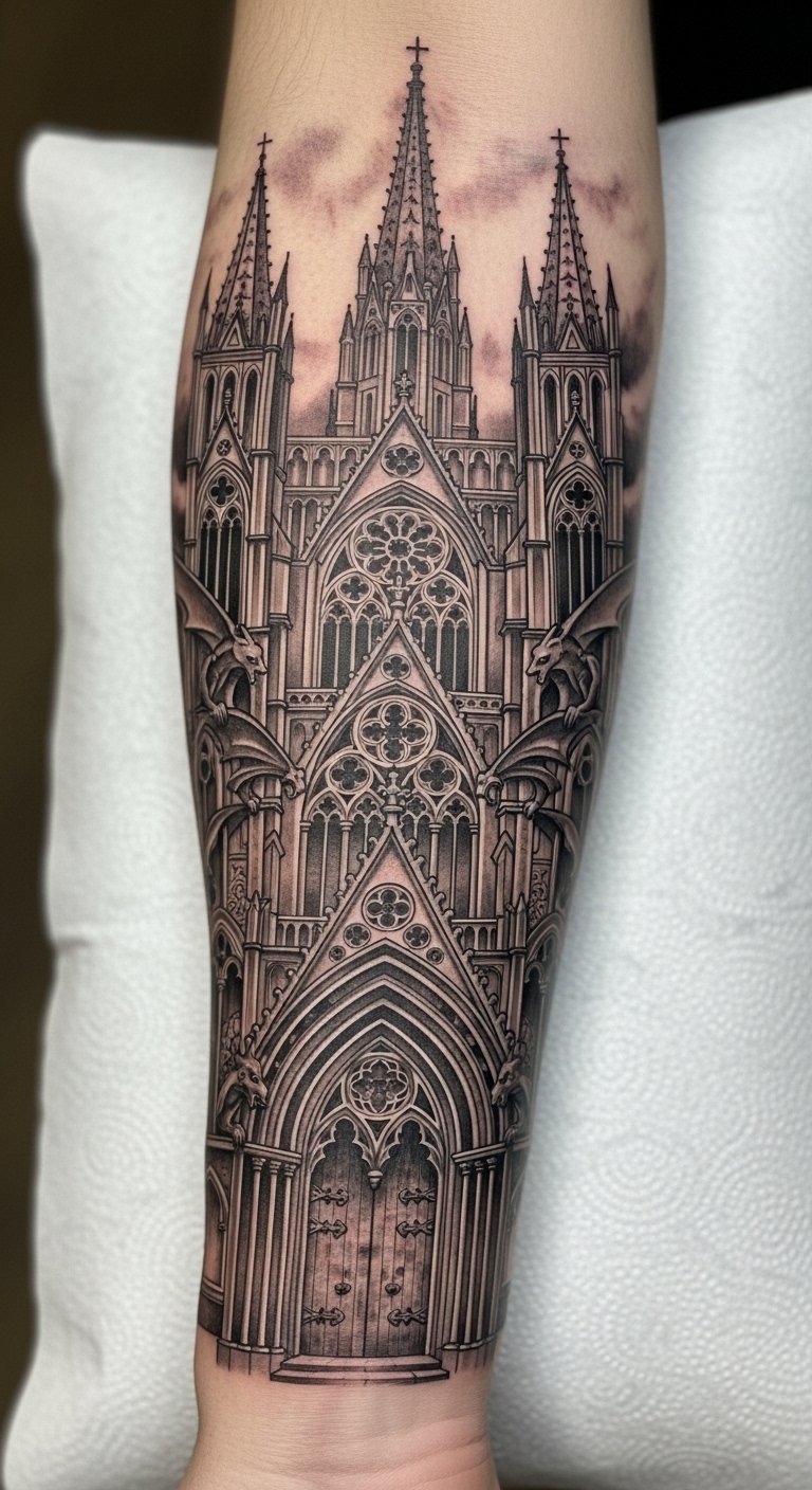 This tattoo design, placed prominently on the forearm, symbolizes strength and protection through its gargoyle motifs, which are often seen as guardians in Gothic architecture.