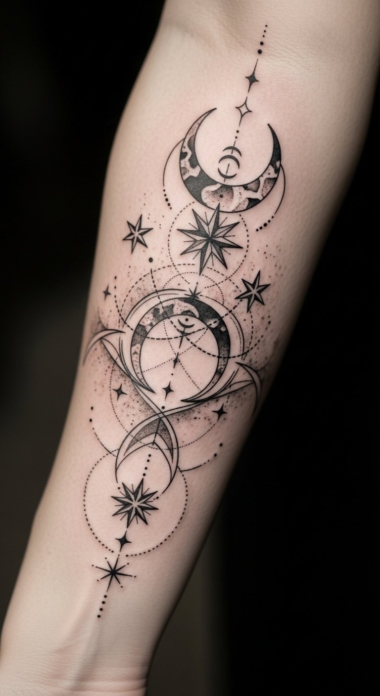 This tattoo symbolizes the connection between spirituality and the ethereal beauty of the night sky, embodying the wearer’s fascination with the gothic aesthetic. The placement on the forearm allows for visibility and personal expression, serving as a constant reminder of the mystical allure of life and the unknown. The intricate details invite admiration while reflecting a sense of individuality and depth in the wearer’s journey.