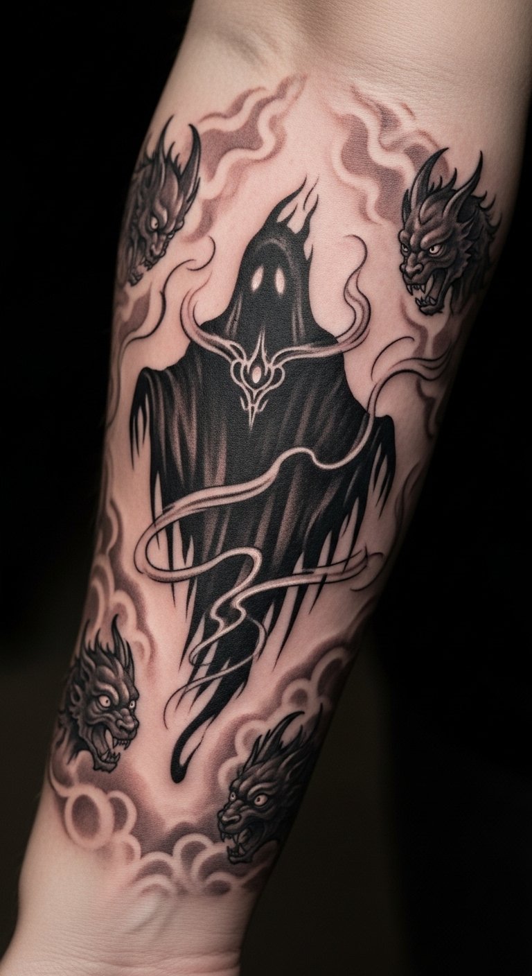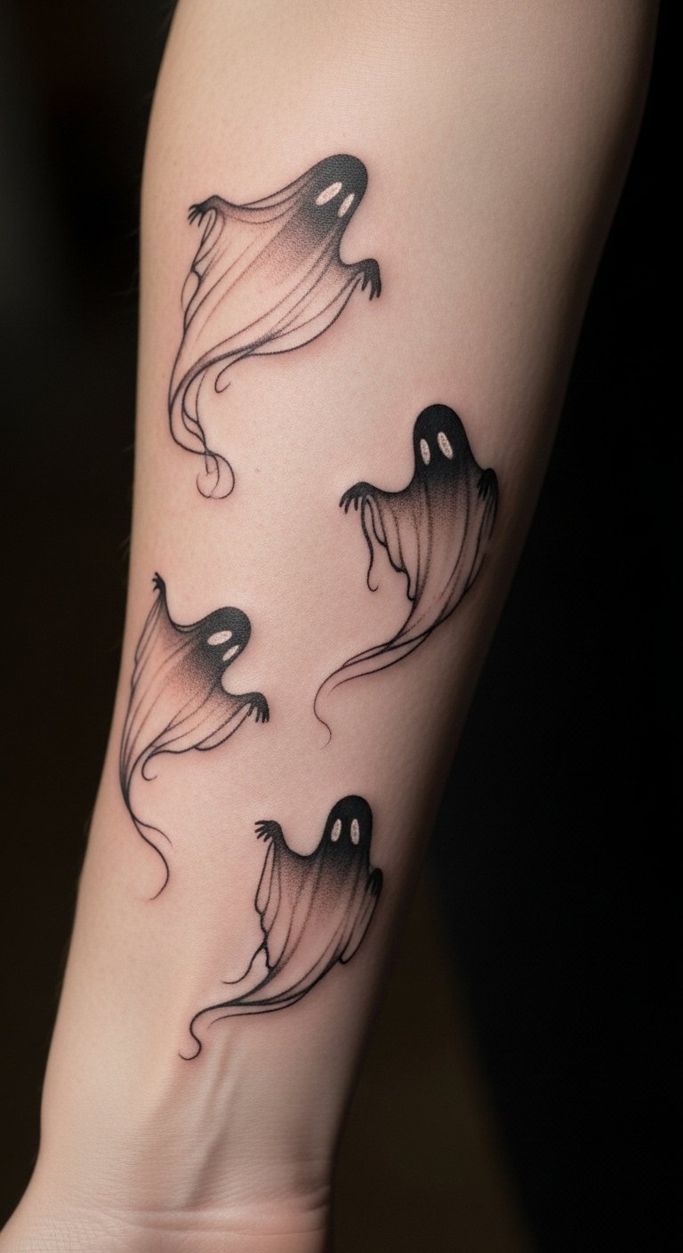 Placed on the forearm, this tattoo becomes a captivating piece of art that invites curiosity and introspection. It serves as a reminder of the unseen forces around us, encouraging the wearer to embrace the spectral allure of the unknown, while also allowing for personal expression through its intricate and delicate design.