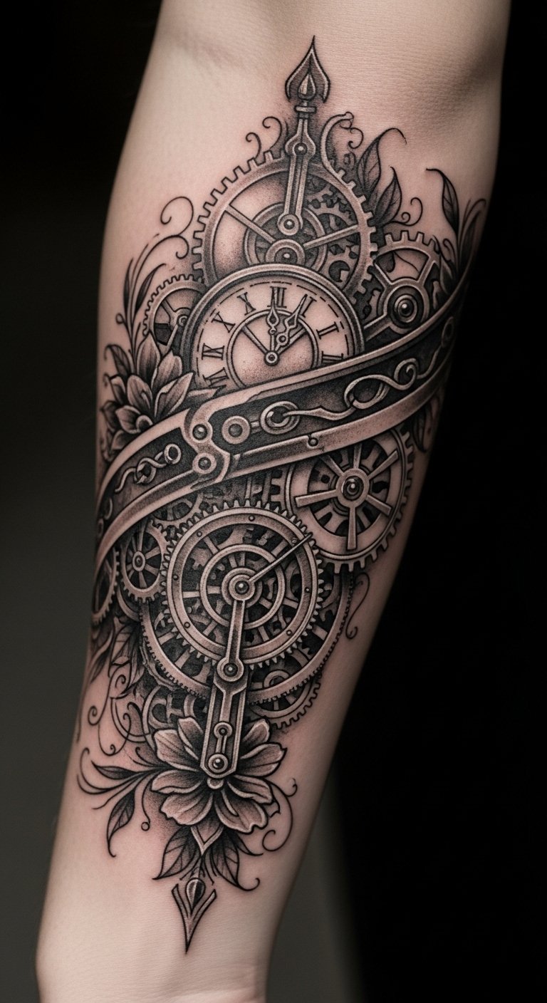 This gothic clockwork tattoo on the forearm symbolizes the balance of beauty and decay, portraying the relentless passage of time through its intricate gears.