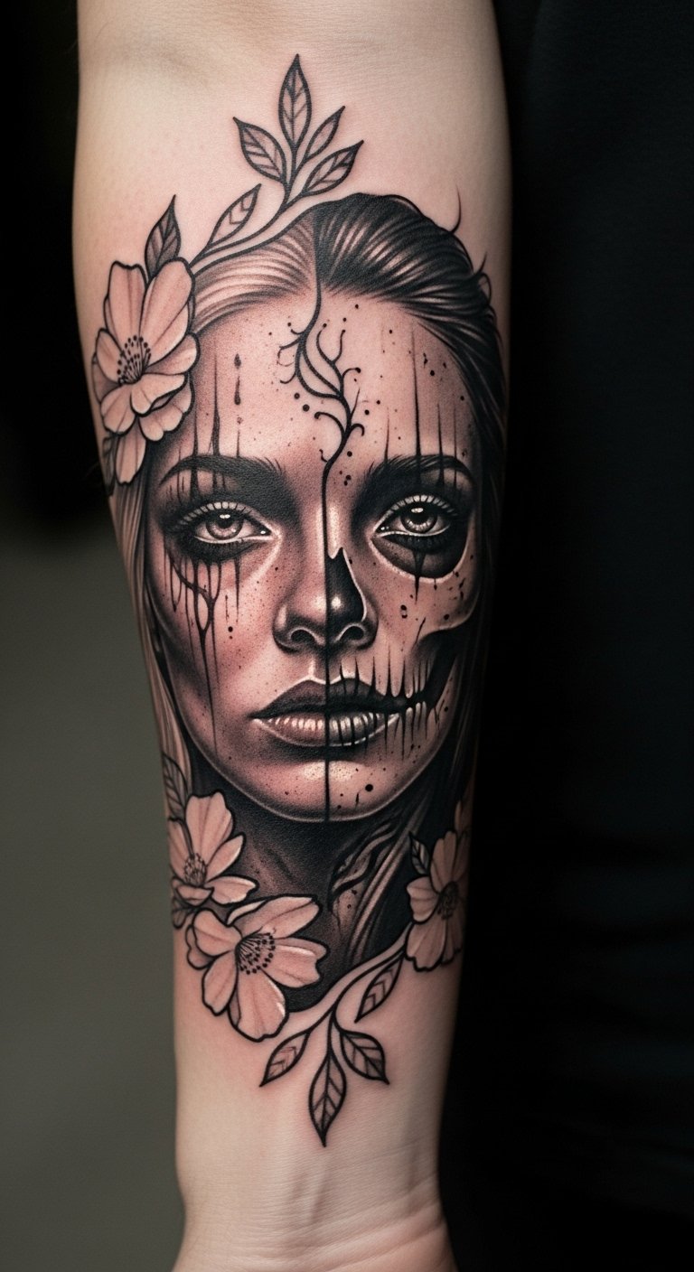 This tattoo captures the essence of macabre beauty, illustrating the duality of existence through the haunting expression of the face.