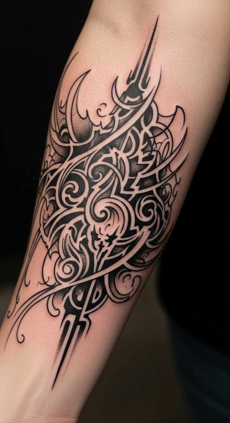 The bold strokes reflect strength and resilience, while the intricate patterns evoke a sense of depth and complexity, capturing the wearer’s spirit and personal story.