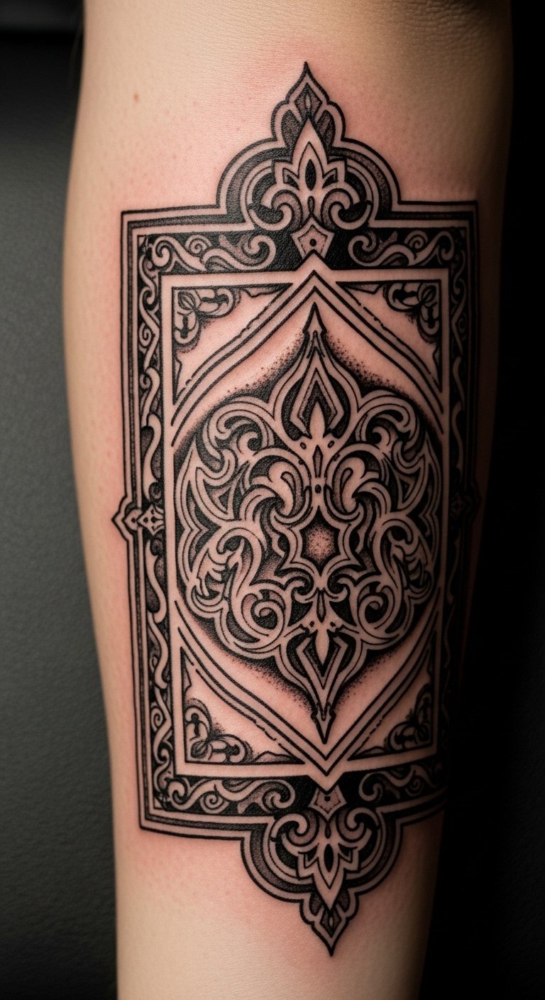 The filigree patterns evoke feelings of mystery and nostalgia, making it a perfect choice for those wishing to express their connection to gothic aesthetics and personal stories through body art.