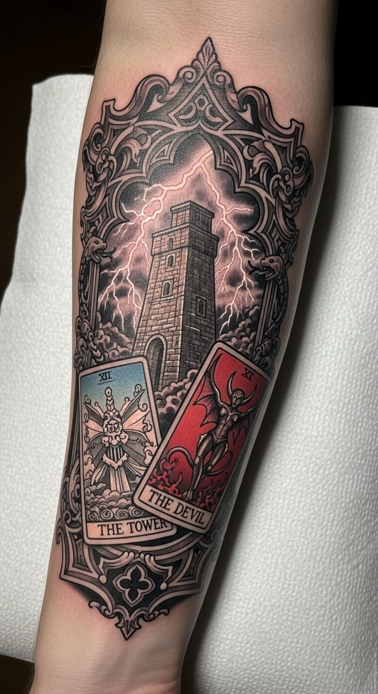 The Tower represents upheaval and revelation, while The Devil embodies temptation and the darker aspects of human nature.