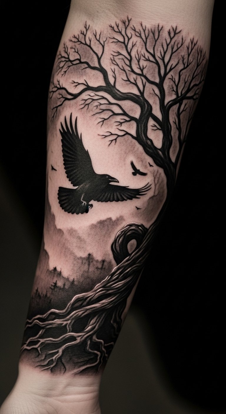 The raven represents transformation and mystery, while the twisted tree echoes resilience and the passage of time.