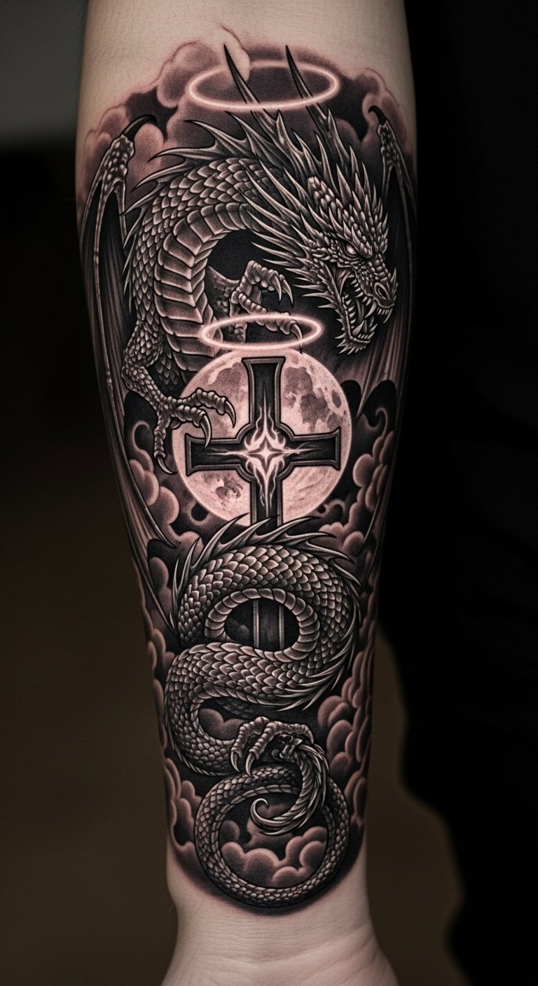 This tattoo symbolizes the eternal struggle between light and darkness, with the dragon representing power and transformation, while the moonlit cross embodies faith and protection.