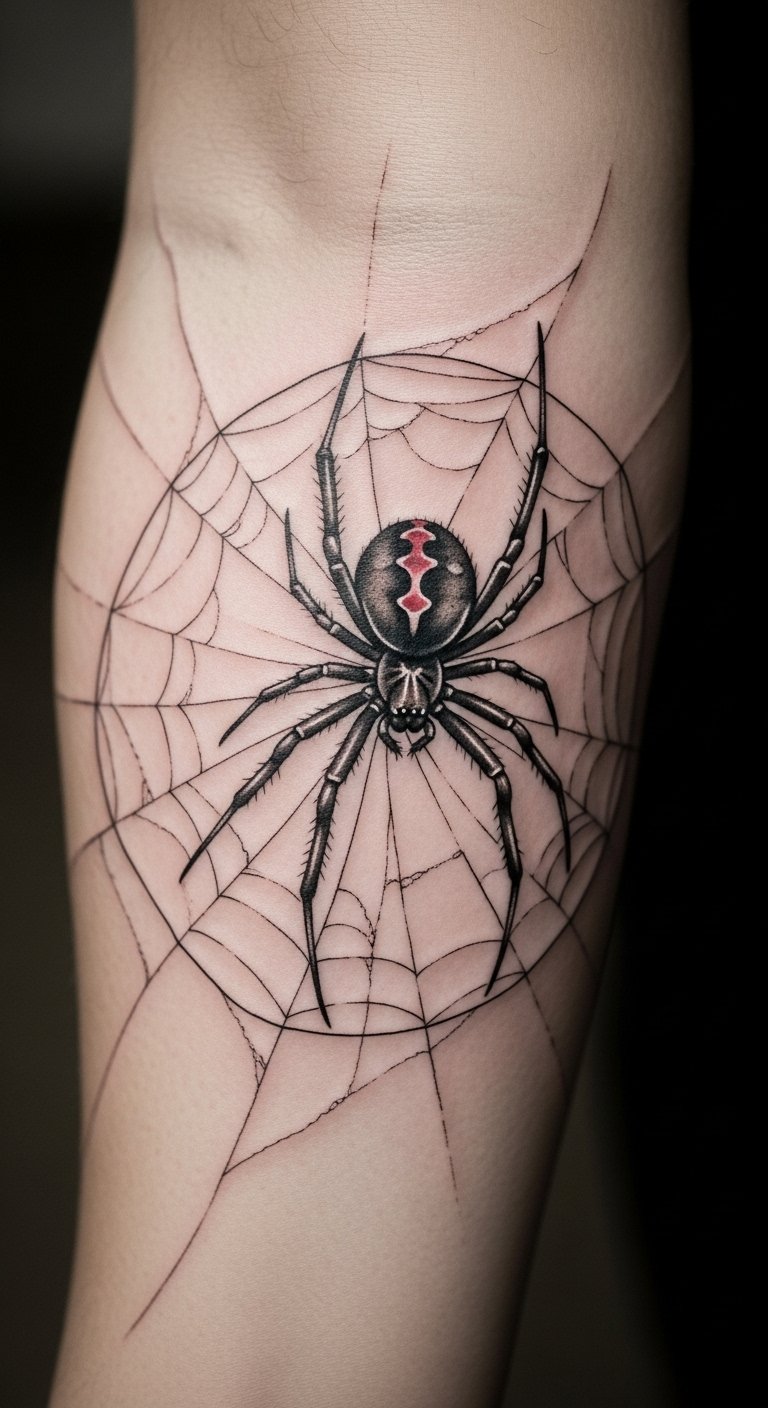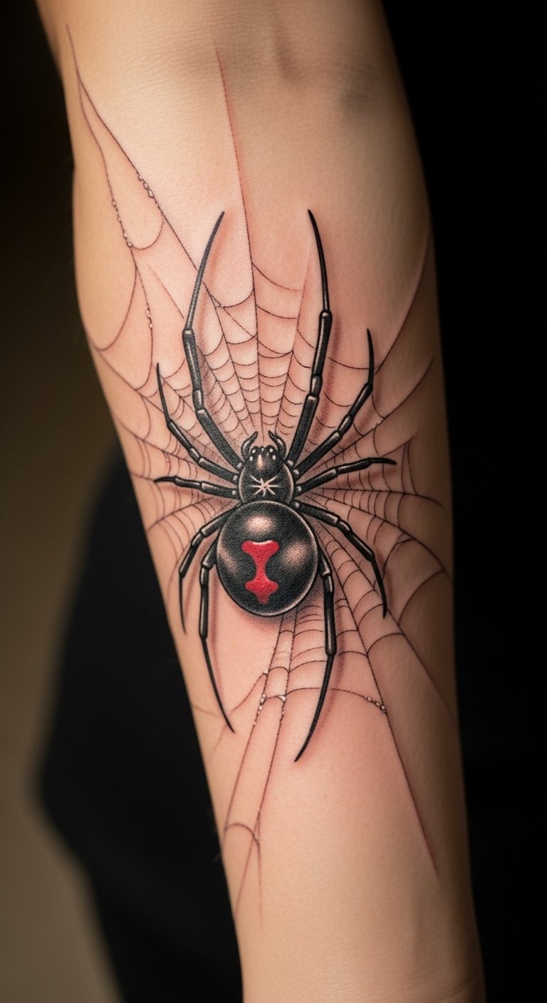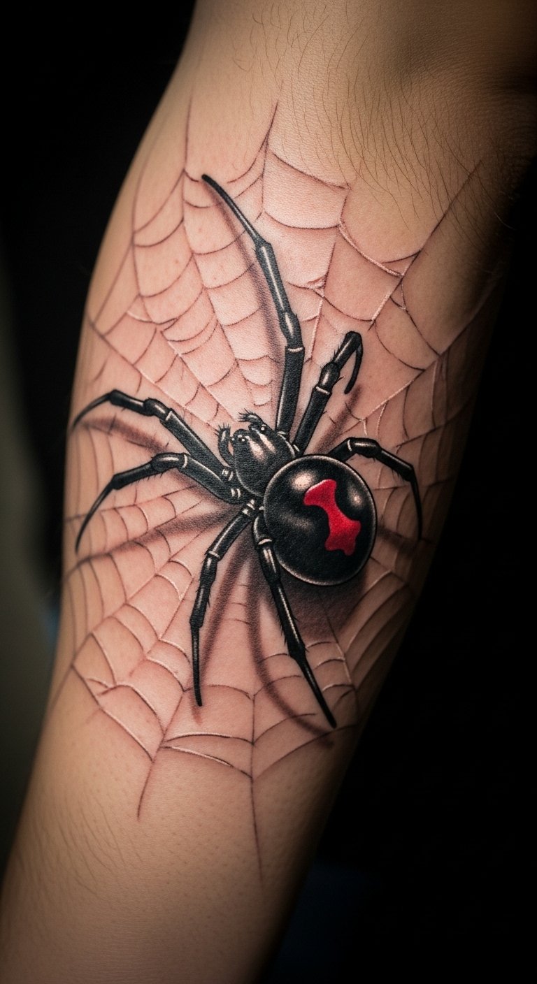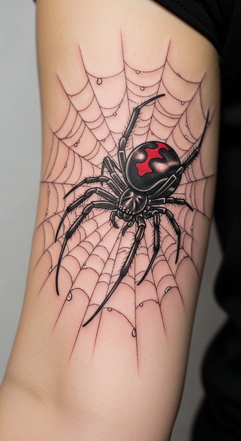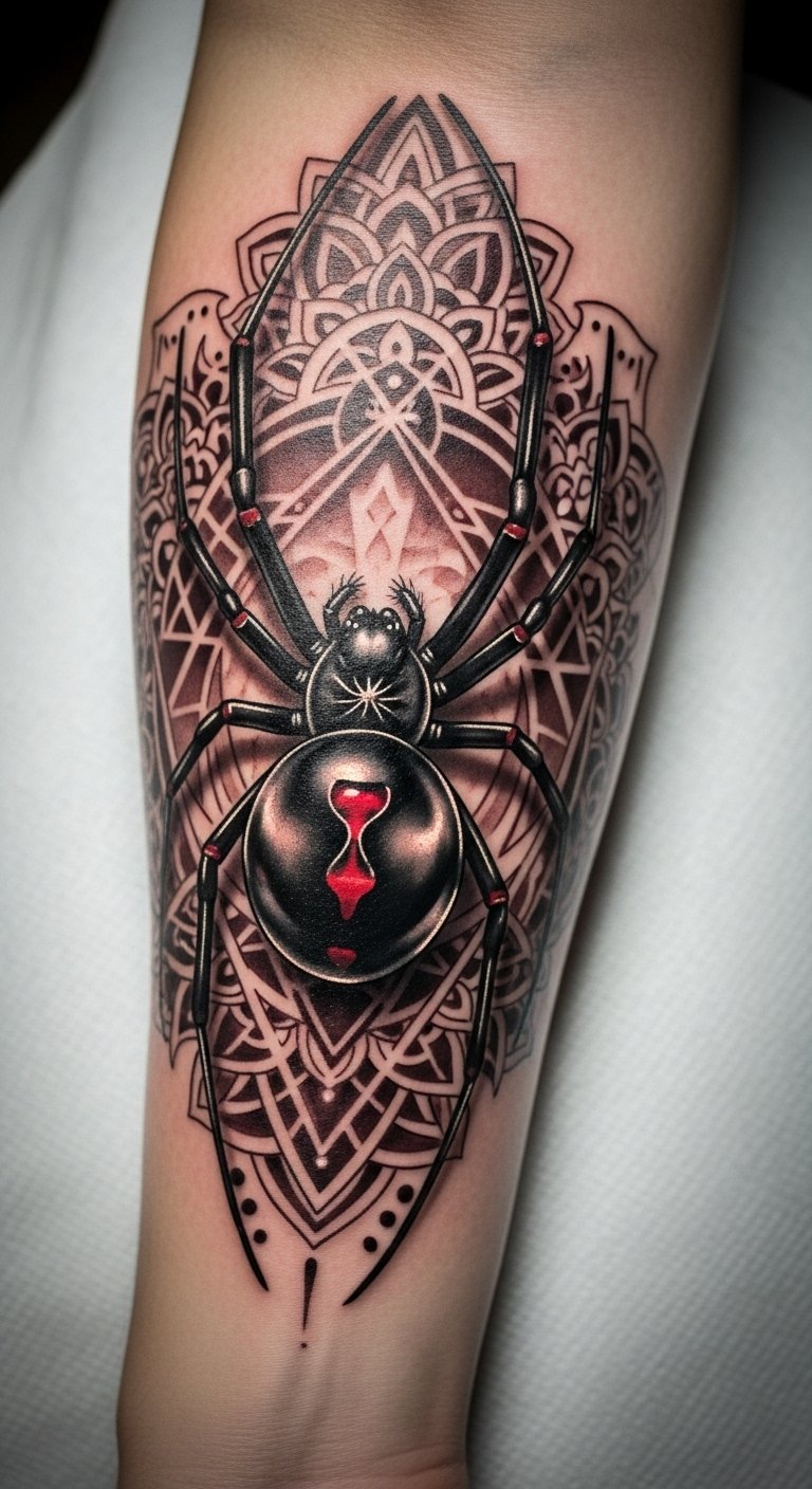 The black widow tattoo symbolizes strength, resilience, and transformation, making it a powerful statement for the wearer.
