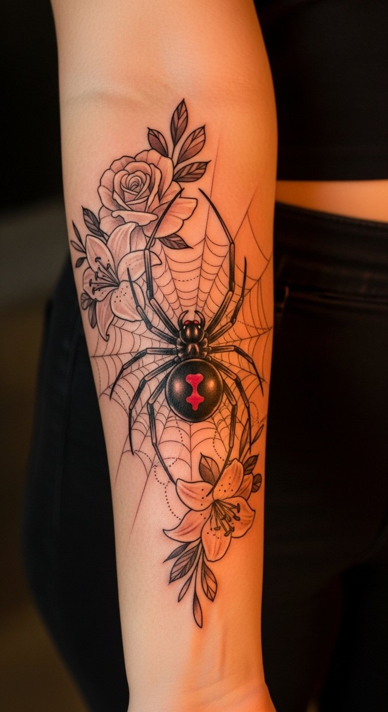 The black widow tattoo on the forearm serves as a bold declaration of female empowerment. Its placement on a visible area signifies a proud embrace of one’s identity and strength.