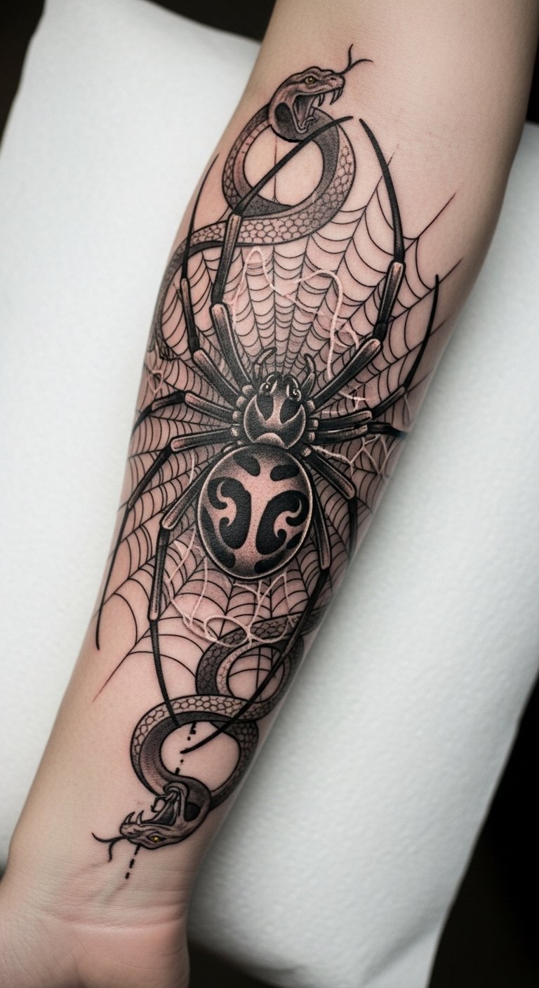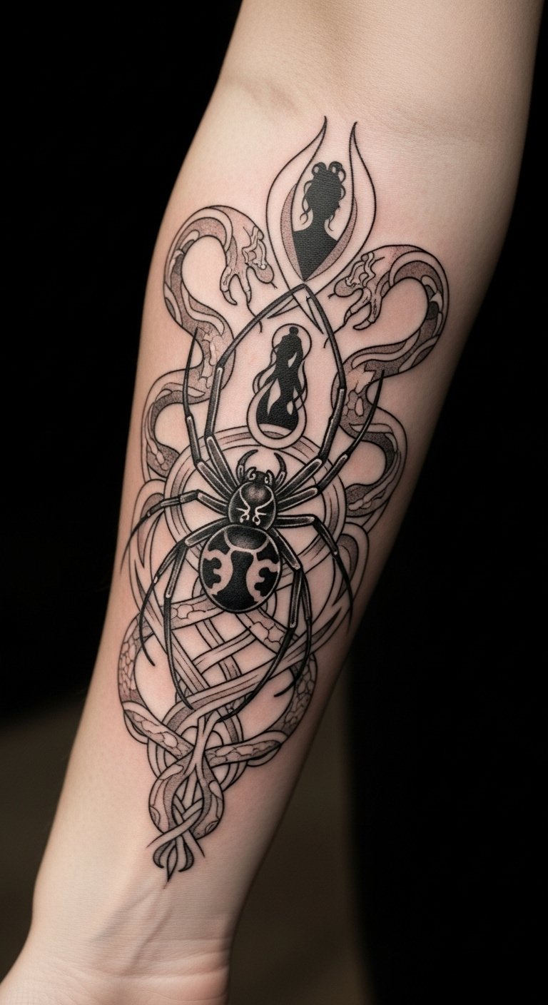 Positioned on the forearm, it serves as a constant reminder of resilience and transformation. The intertwining elements symbolize the power of weaving one’s destiny, much like Arachne, while the spider adds an edge of mystique and danger.