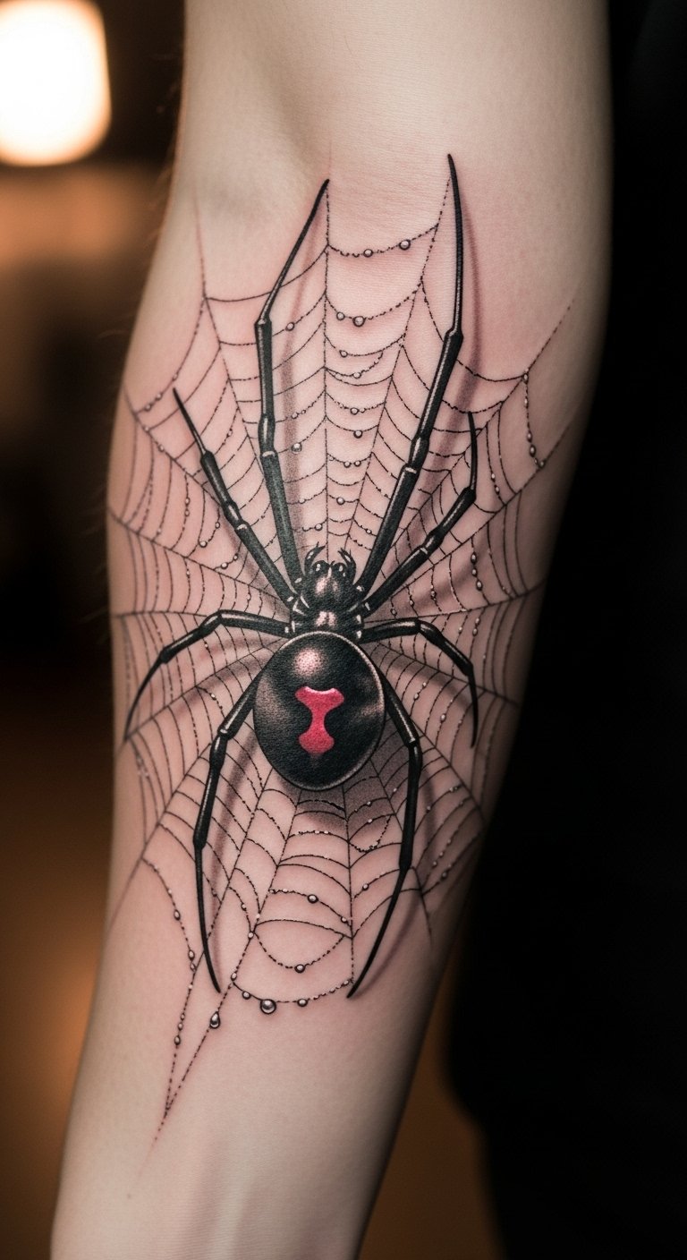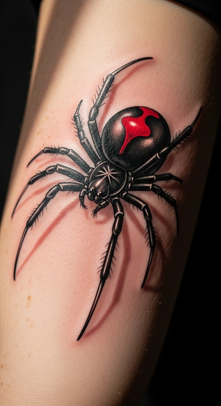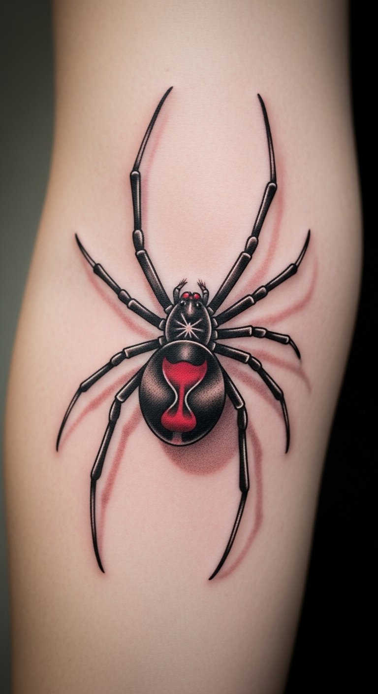 This black widow tattoo symbolizes strength and defiance, serving as a powerful visual deterrent against harmful influences.