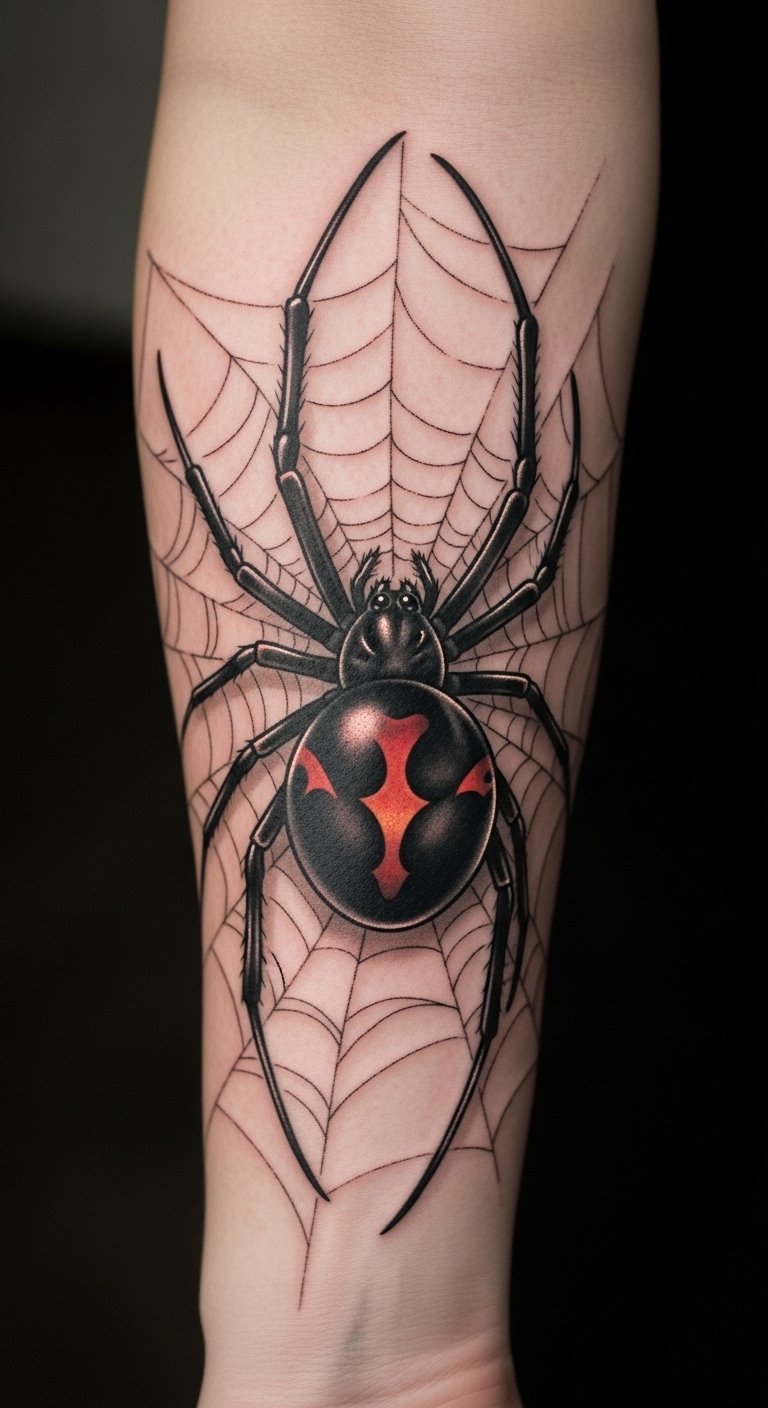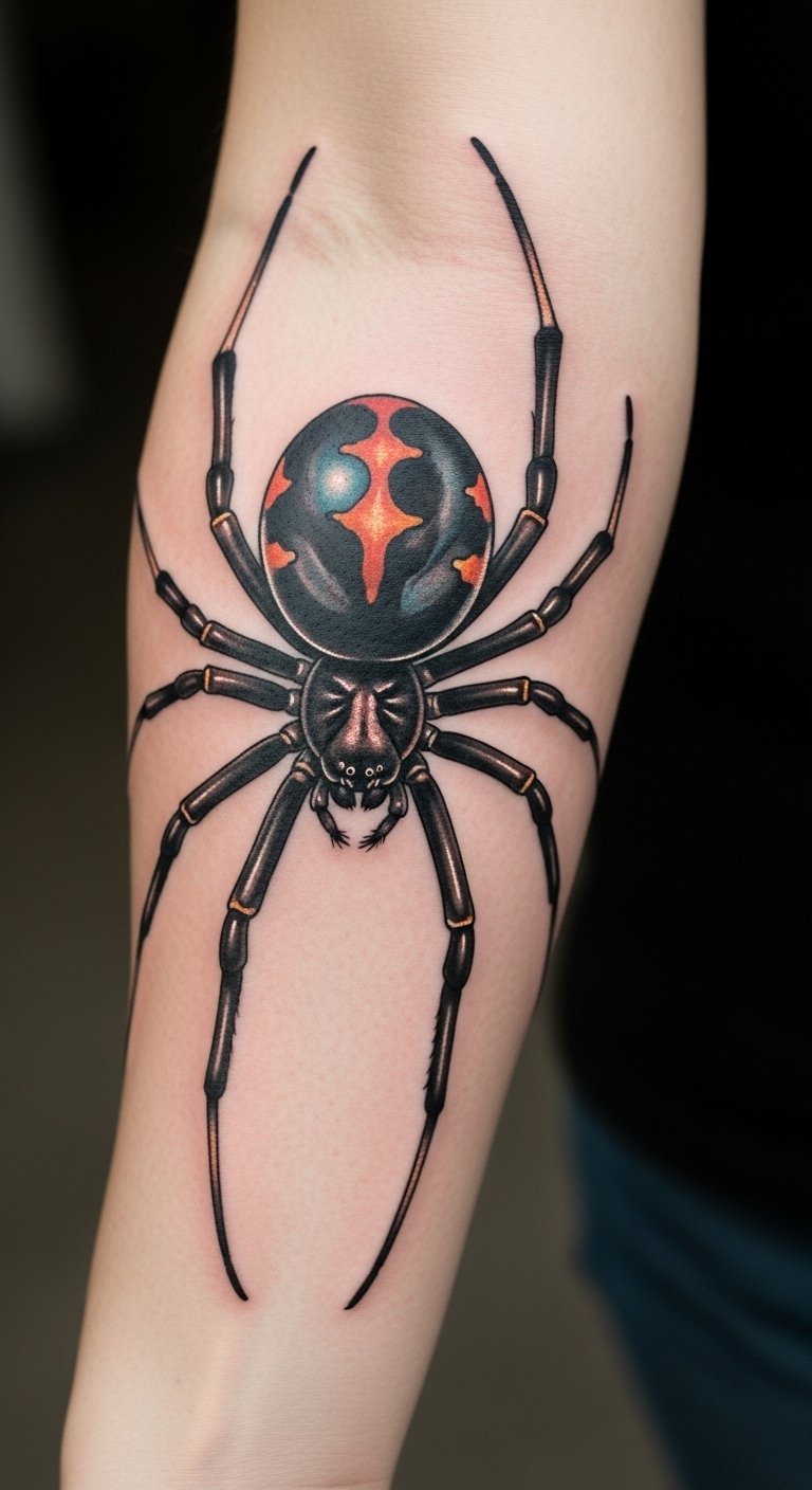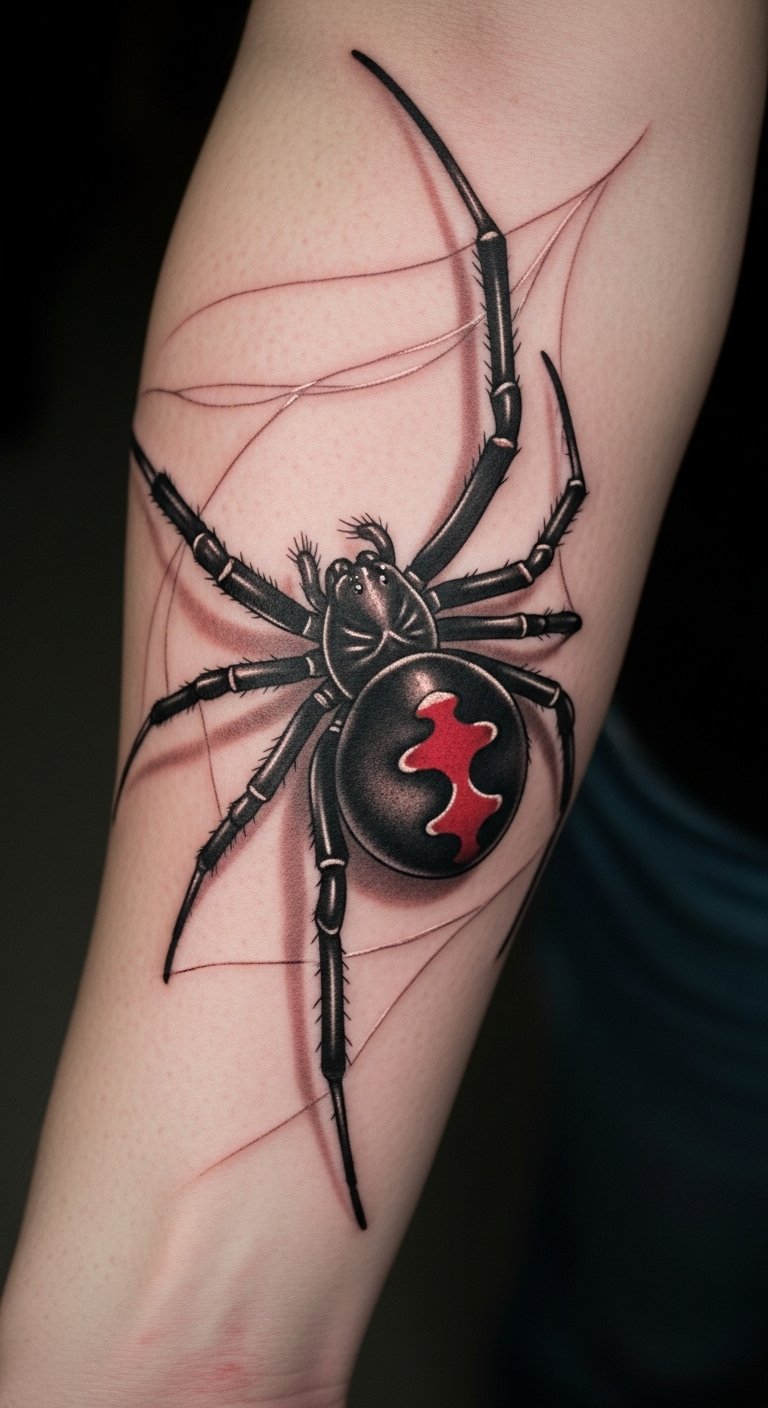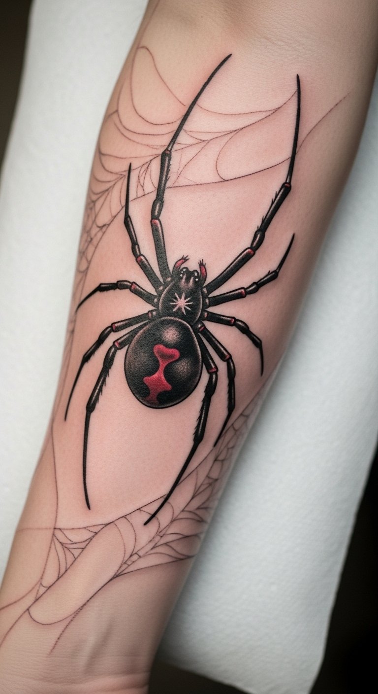 This black widow tattoo symbolizes strength and defiance, serving as a powerful visual deterrent against harmful influences.