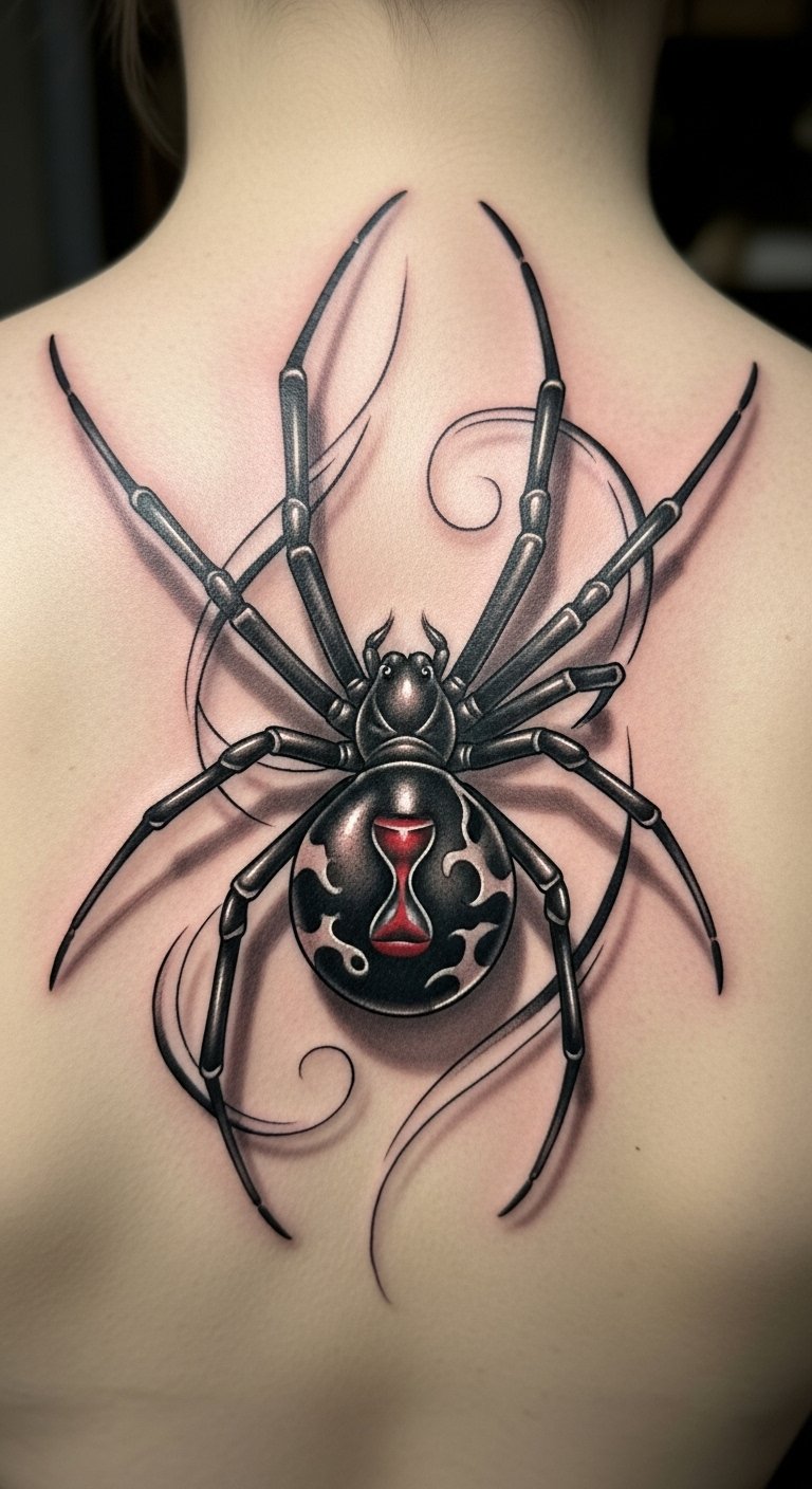 The black widow tattoo on the upper back serves as a powerful emblem of resilience, intricately woven into the wearer’s life story. The spider, with its strong presence, represents overcoming challenges and embracing one’s unique journey.