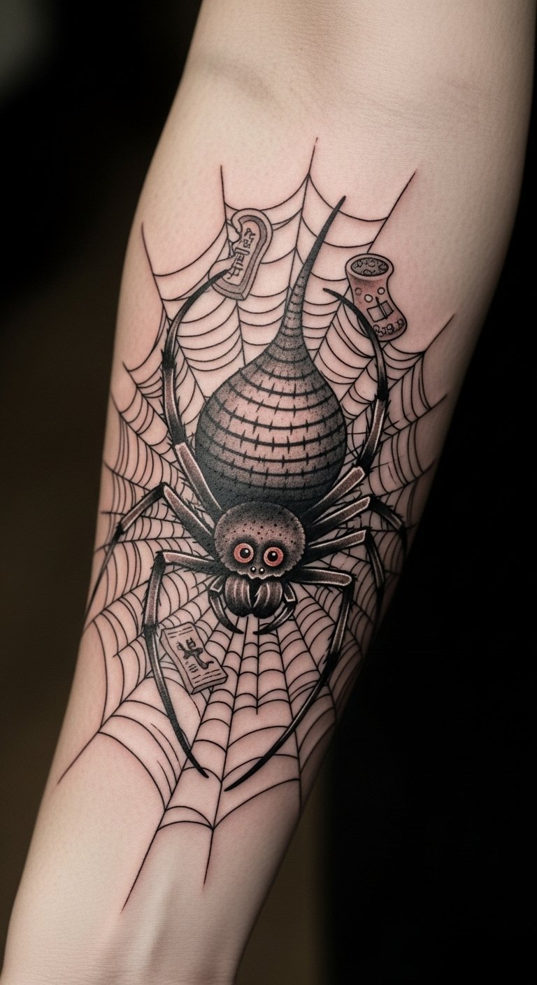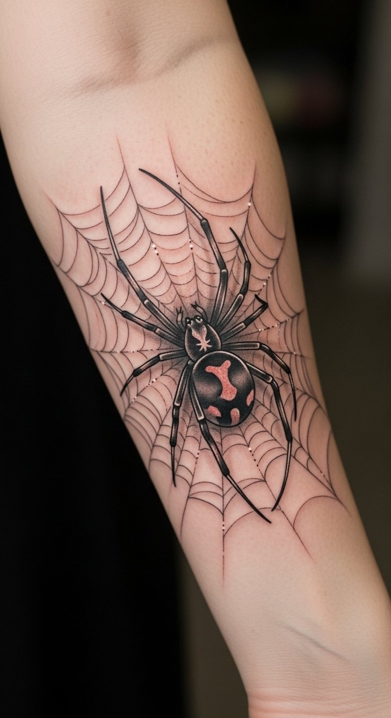 The black widow tattoo on the forearm serves as a powerful emblem of personal growth, capturing the essence of transformation and resilience.