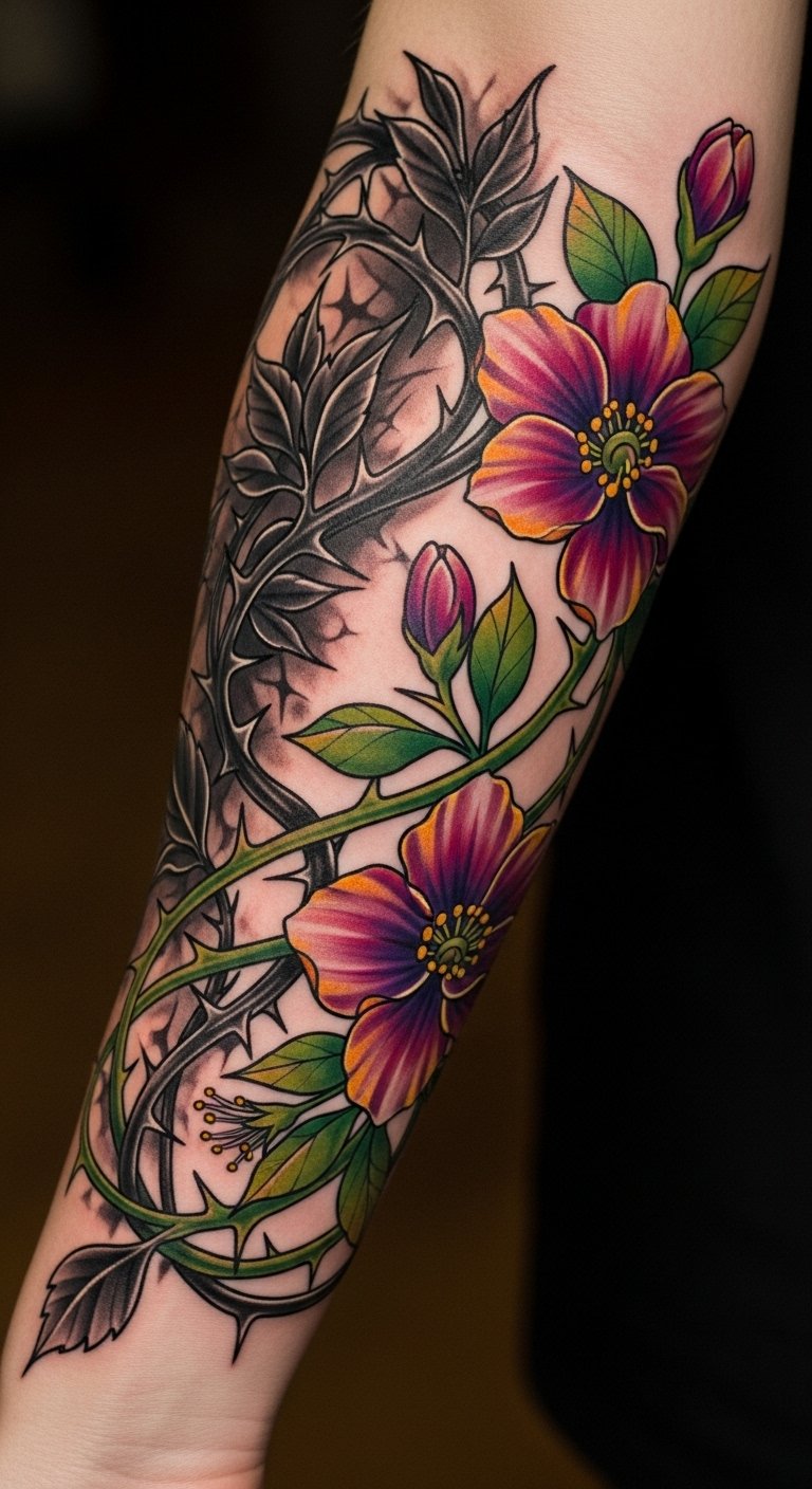 This tattoo symbolizes the duality of identity, where the dark thorns represent struggles, fears, and the shadow self, while the vibrant flowers embody growth, hope, and self-acceptance.