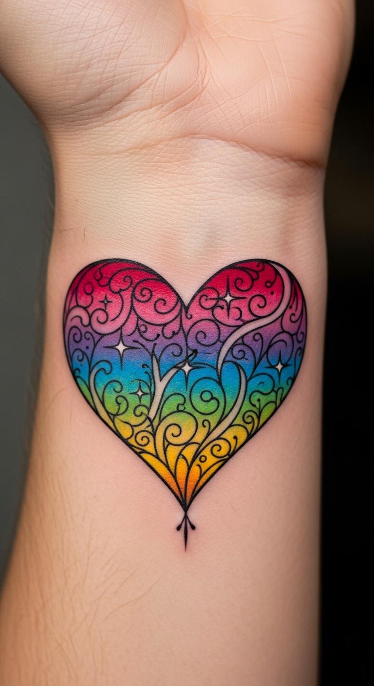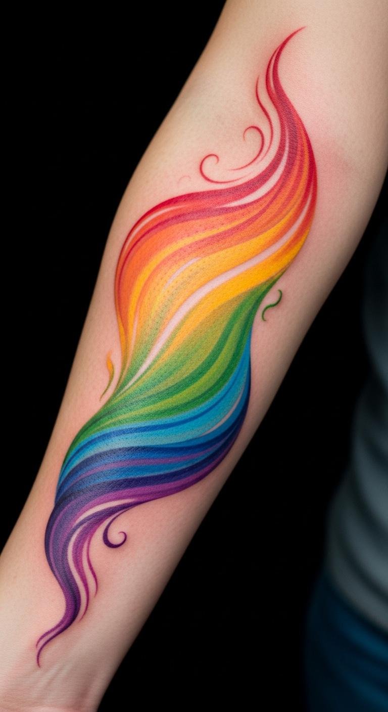 Positioned on the forearm, it serves as a constant reminder of personal growth and the beauty of individuality. The vibrant design invites connections and conversations, celebrating the wearer’s unique identity and the freedom that comes with embracing oneself fully.