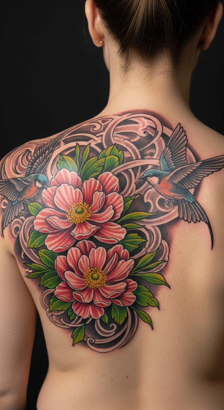 This tattoo design symbolizes personal growth and freedom, with the blooming flower representing blossoming potential and the birds symbolizing the spirit’s desire to soar.