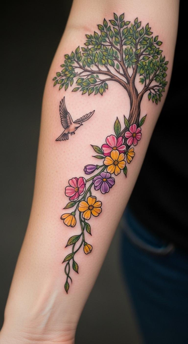This tattoo design embodies the essence of self-love and connection to nature, reflecting resilience and beauty through the imagery of flowers, trees, and birds.
