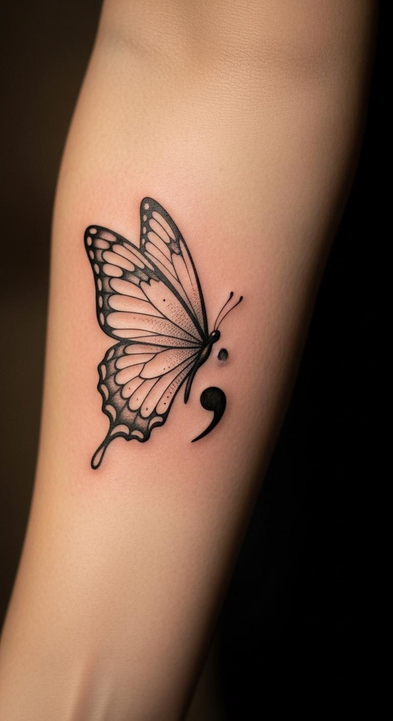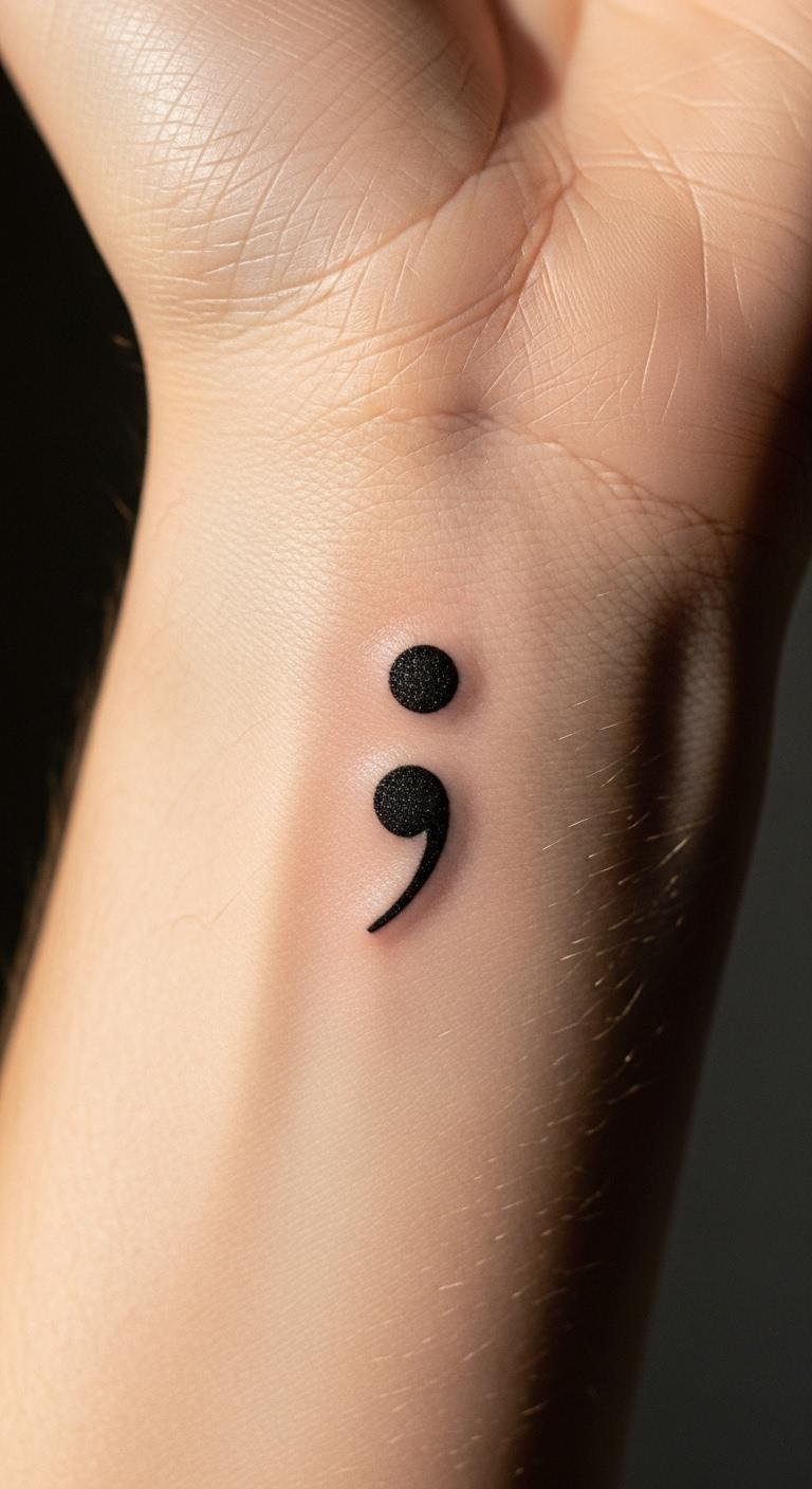The semicolon signifies strength and continuity, reminding the wearer of their ability to persevere through difficult times. Placed on the forearm, it serves as a daily reminder of one’s evolution and the importance of self-acceptance, visible to both the wearer and the world, fostering connection and inspiration.