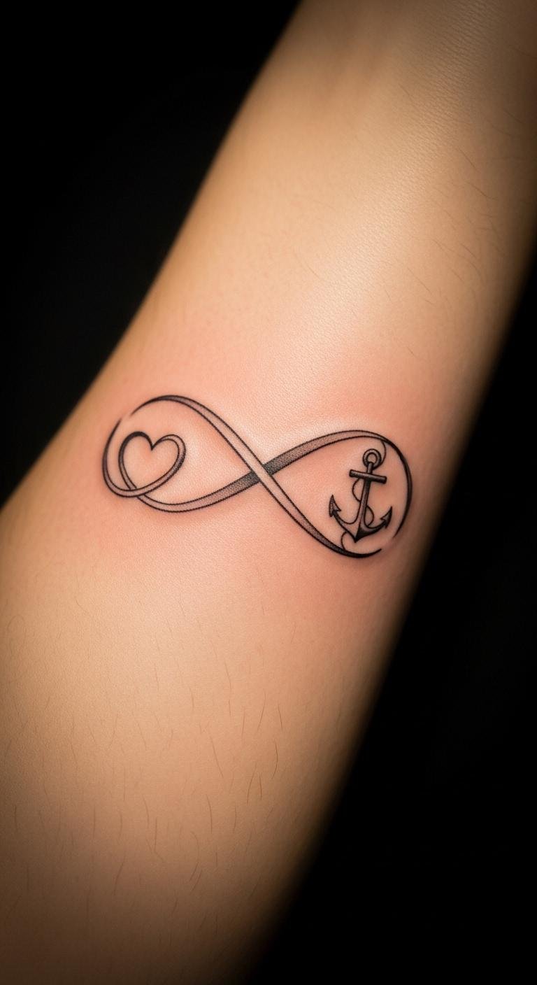 This tattoo design represents the eternal bond between friends or loved ones, symbolizing both love and stability. The infinity symbol signifies an everlasting connection, while the heart embodies affection, and the anchor reflects grounding support through life’s challenges.