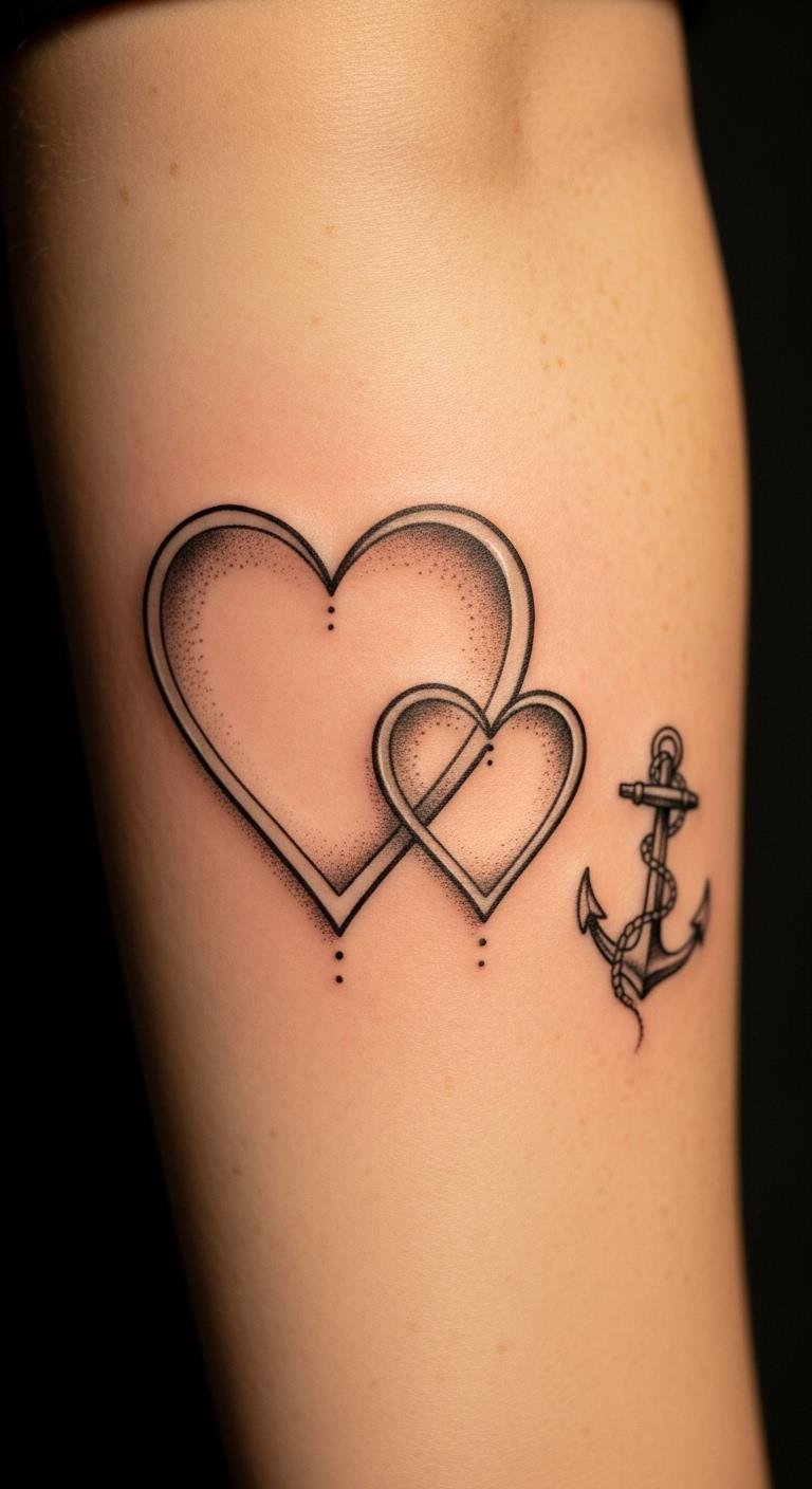 The intertwined hearts symbolize unity and emotional ties, while the anchor signifies safety and guidance.