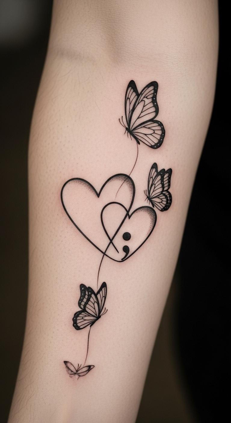The hearts signify compassion for oneself, while the butterflies represent transformation and growth. The semicolon symbolizes the continuation of one’s story, emphasizing resilience in the face of challenges.