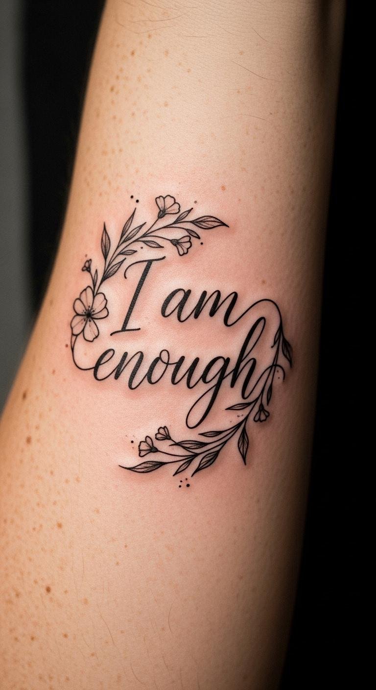 This tattoo serves as a daily affirmation, a visible reminder of one’s inherent worth and resilience. Positioned on the forearm, it invites both the wearer and onlookers to reflect on the powerful message of self-love. The elegant script flows gracefully with the arm’s movement, symbolizing the journey of embracing oneself. This placement allows for easy visibility, encouraging the wearer to acknowledge their strength and beauty every time they glance at the ink, reinforcing a positive mindset throughout their day.