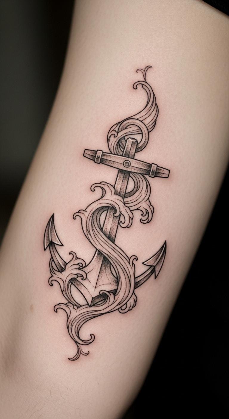 The nautical theme of the anchor, combined with the flowing waves, represents the balance between grounding oneself and embracing the ebb and flow of life, making it a meaningful expression of self-love and empowerment.
