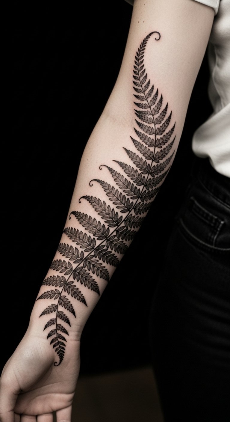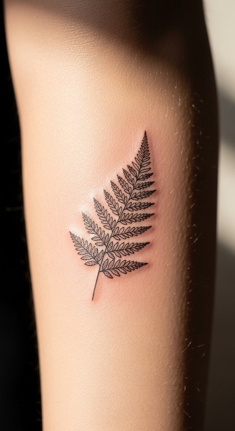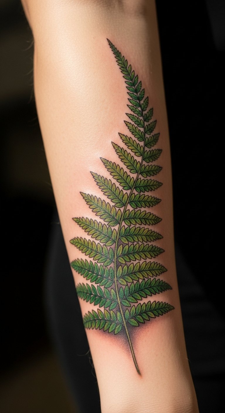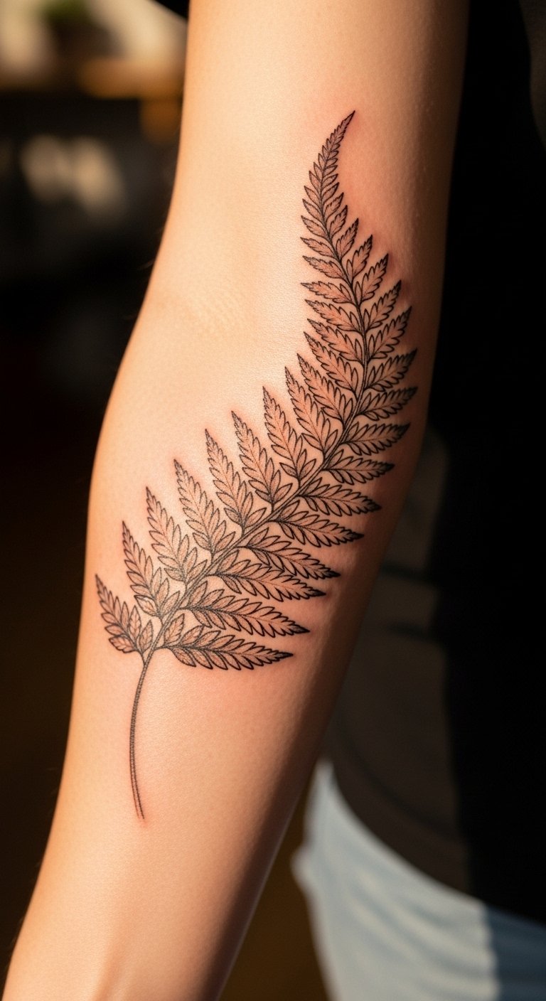 The fern tattoo on the forearm symbolizes resilience and growth, serving as a gentle reminder of one’s connection to nature and personal journey.