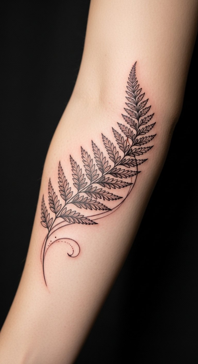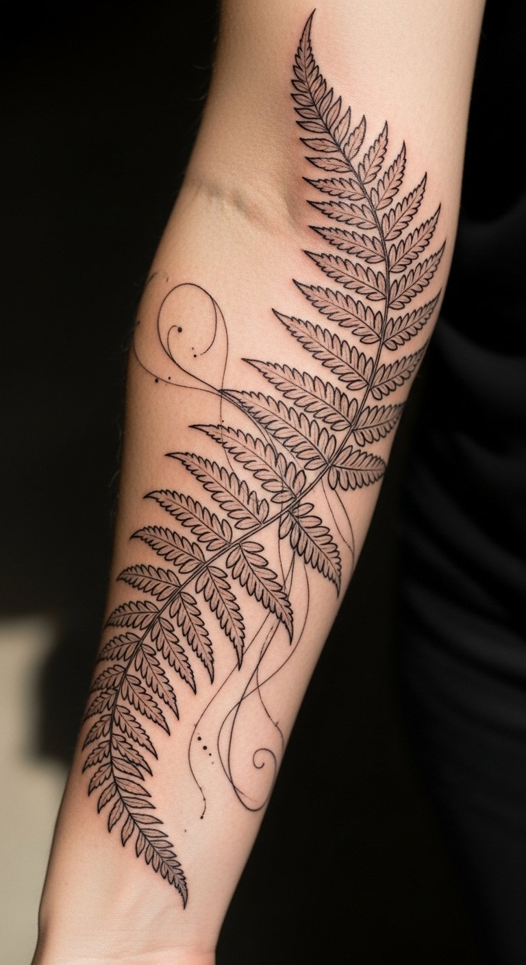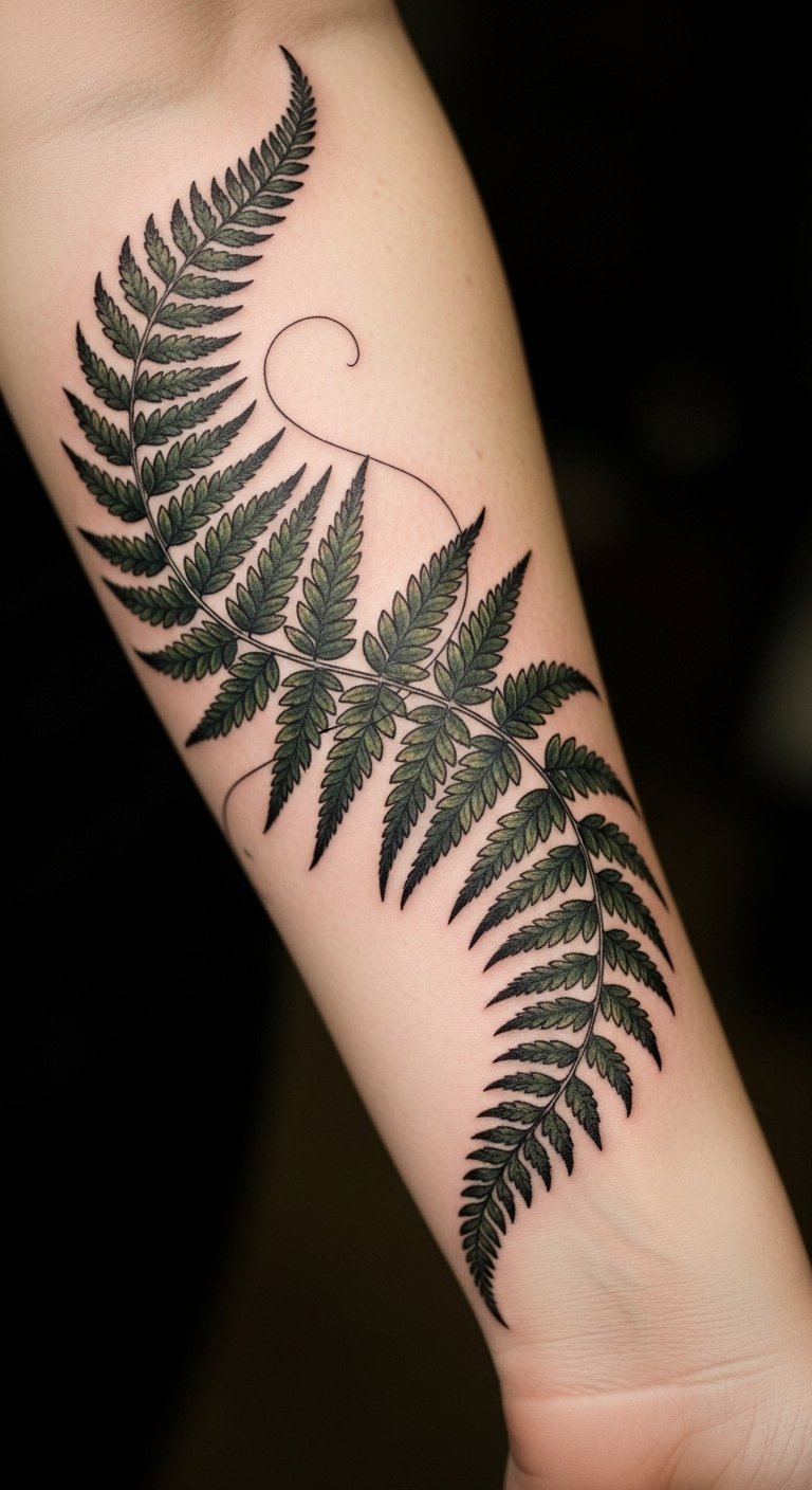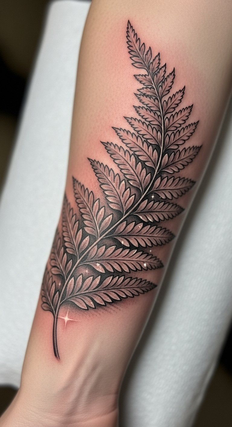 The fern tattoo on the forearm symbolizes resilience and growth, serving as a gentle reminder of one’s connection to nature and personal journey.