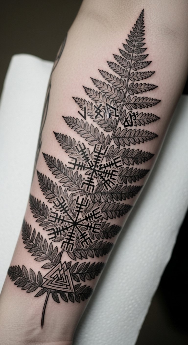 The ferns represent a shield against evil, embodying freedom and strength, while the Norse symbols enhance the connection to the past.