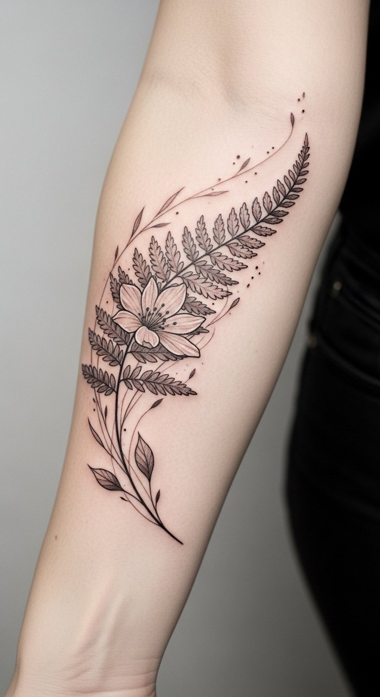 The fern tattoo on the forearm symbolizes your personal journey of resilience and transformation.
