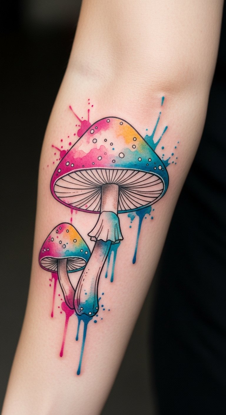 This enchanting mushroom tattoo symbolizes growth and transformation, reflecting an individual’s unique journey through life. Positioned on the forearm, it serves as a constant reminder of personal evolution, inviting curiosity and conversation from those who see it. The use of watercolor adds an ethereal quality, embodying the beauty of nature and the wearer’s connection to it.