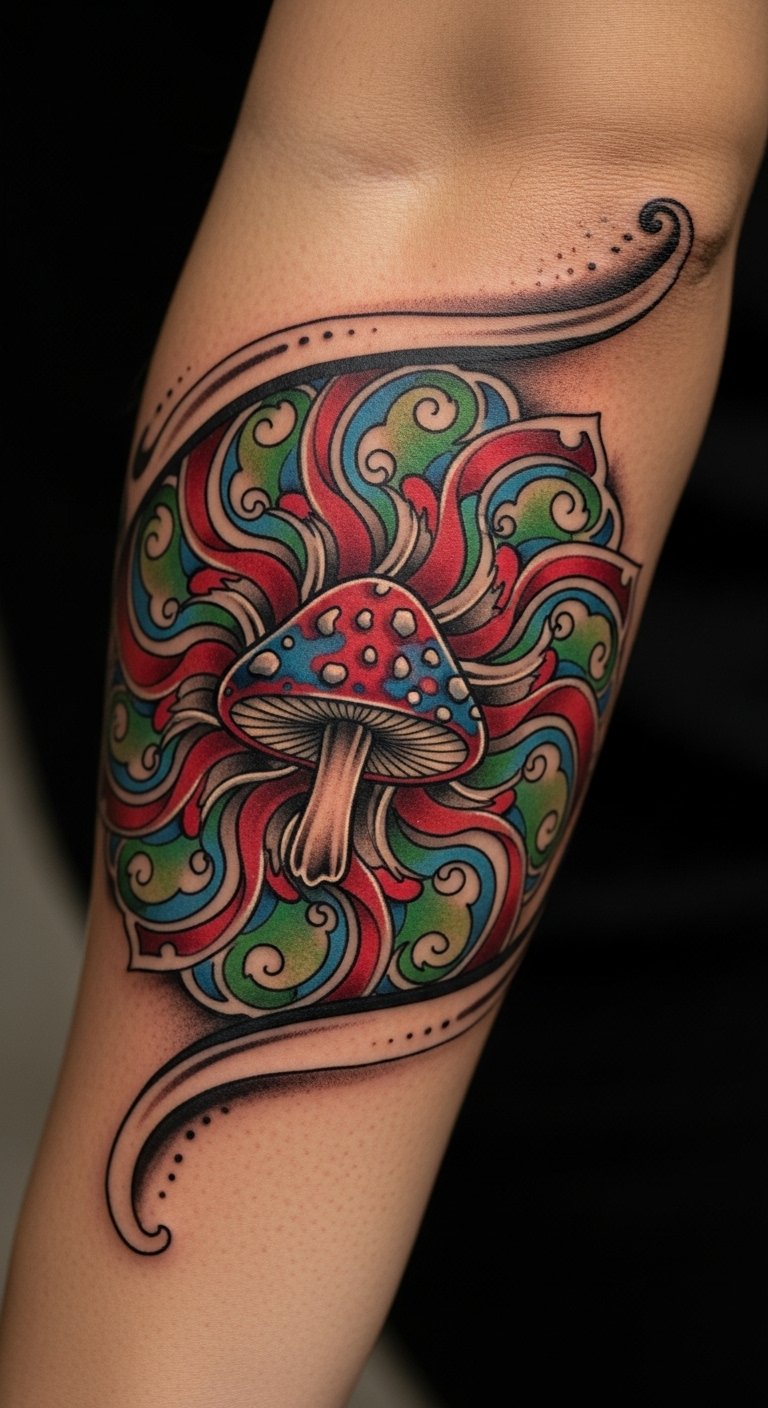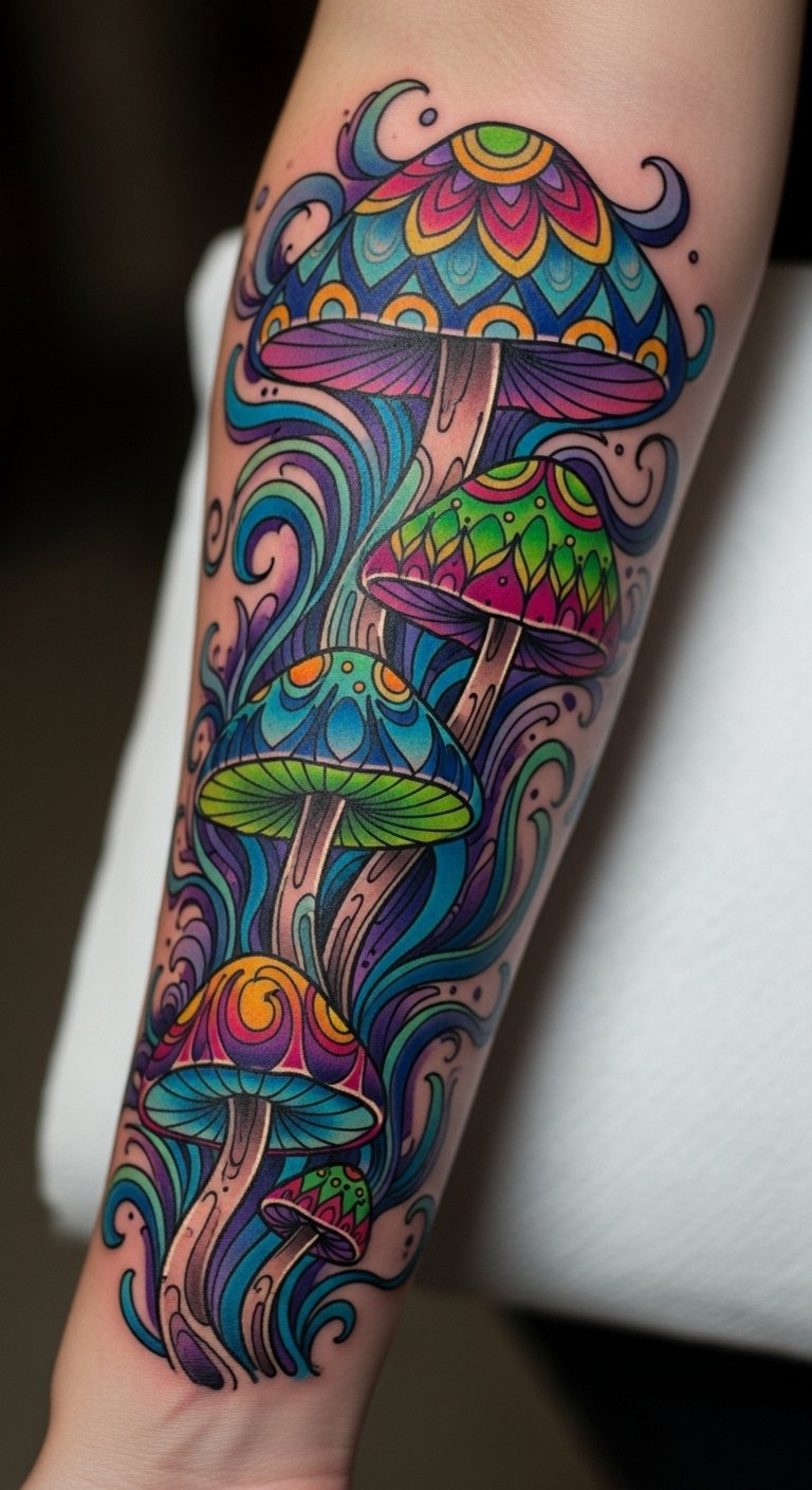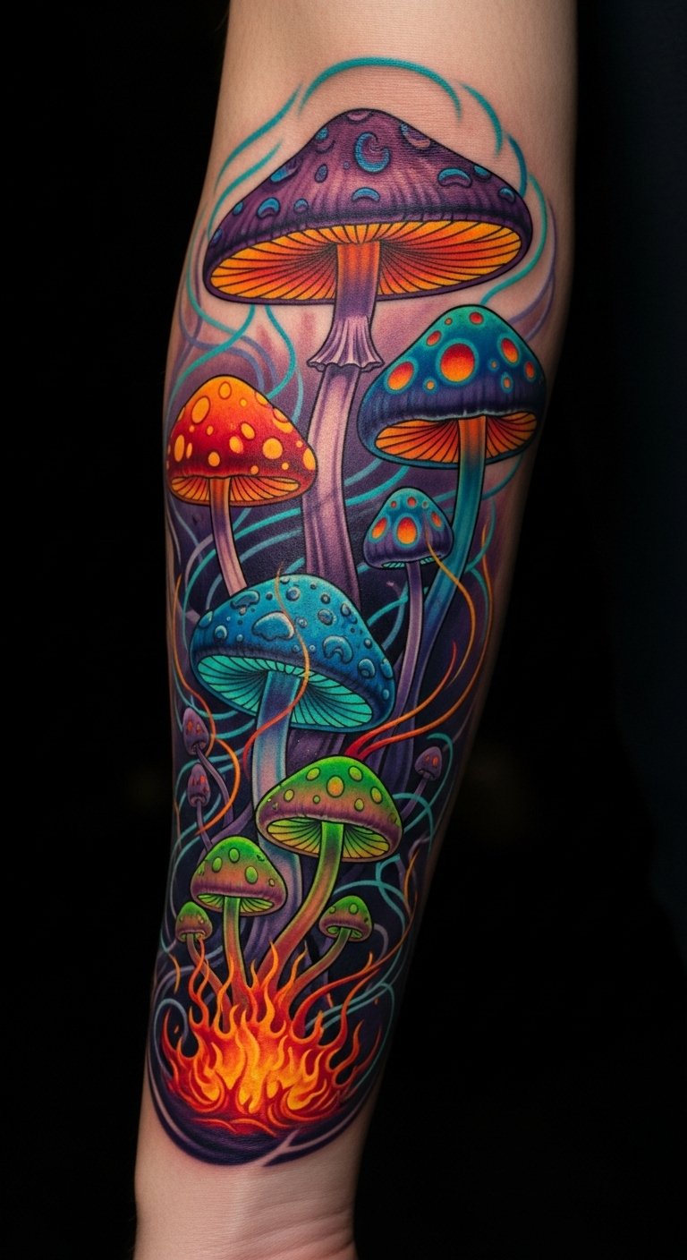 This tattoo embodies the essence of freedom and individuality, with its bold colors and intricate designs symbolizing the rich mythology and symbolism of mushrooms.