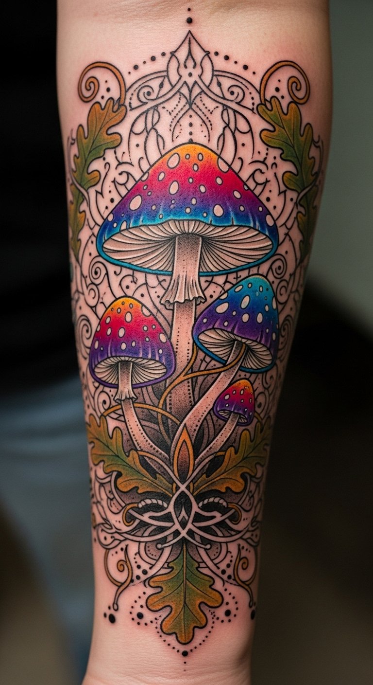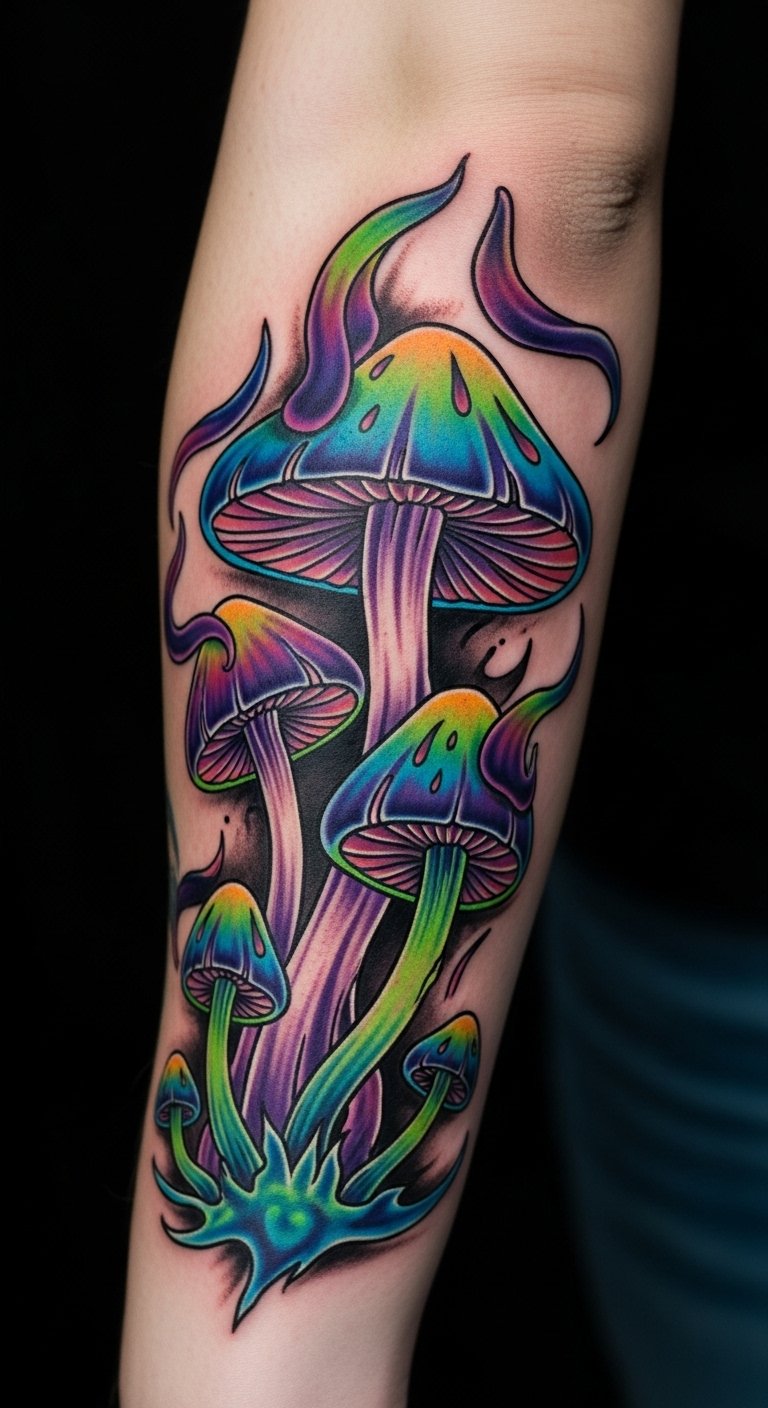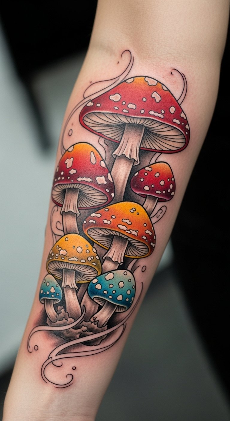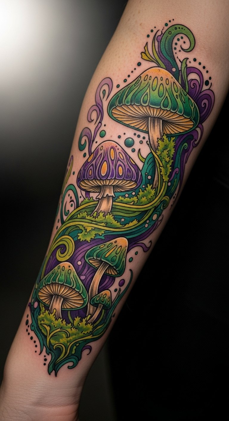 This tattoo embodies the essence of freedom and individuality, with its bold colors and intricate designs symbolizing the rich mythology and symbolism of mushrooms.