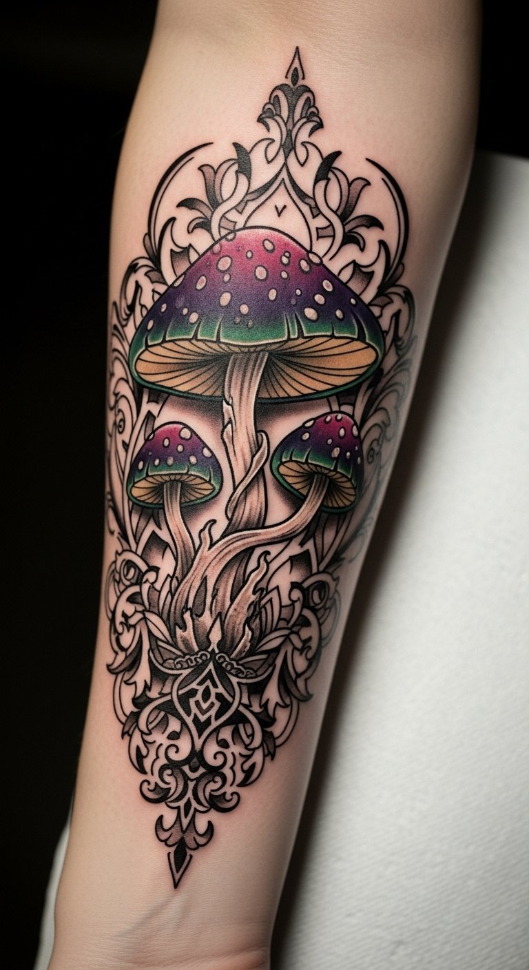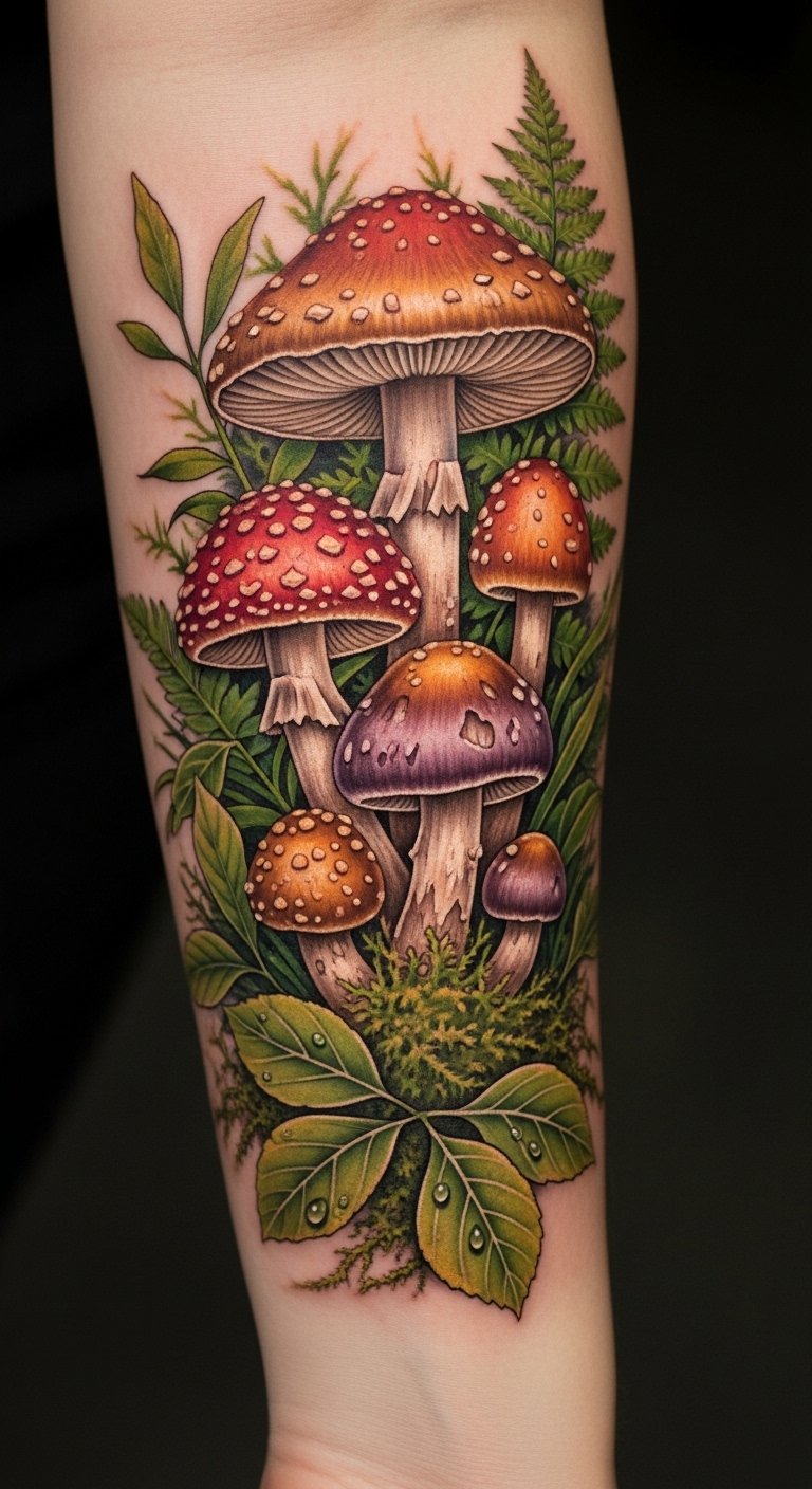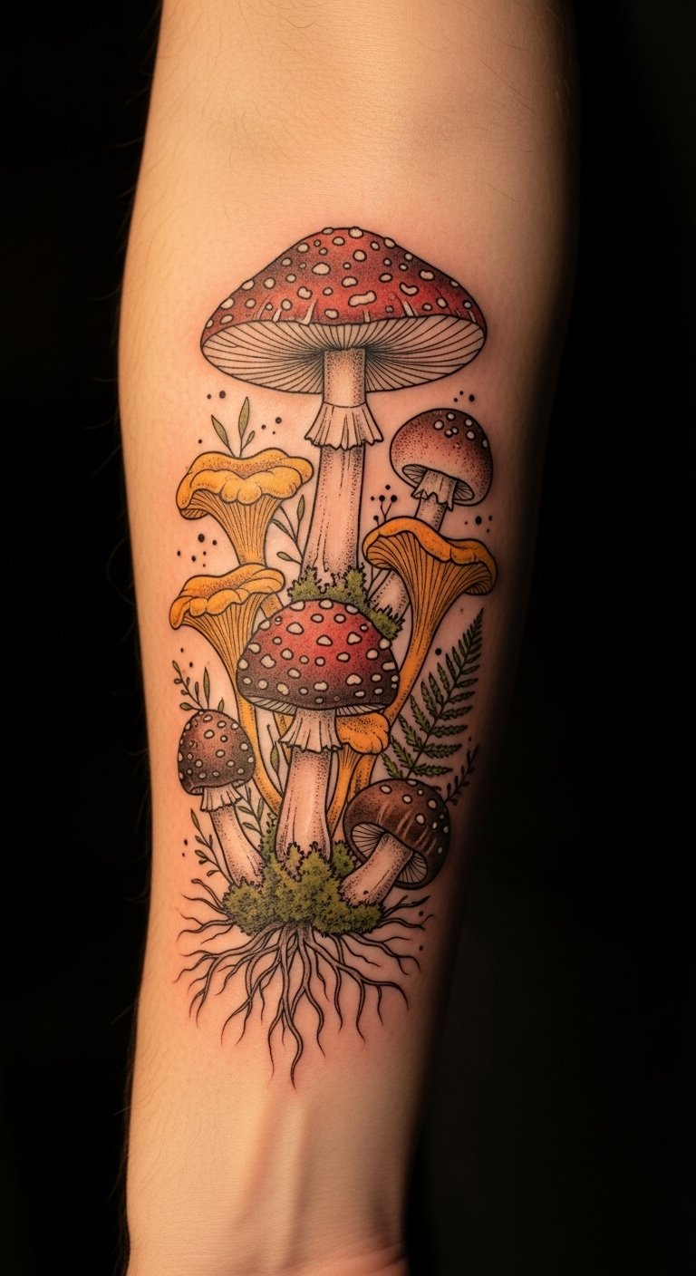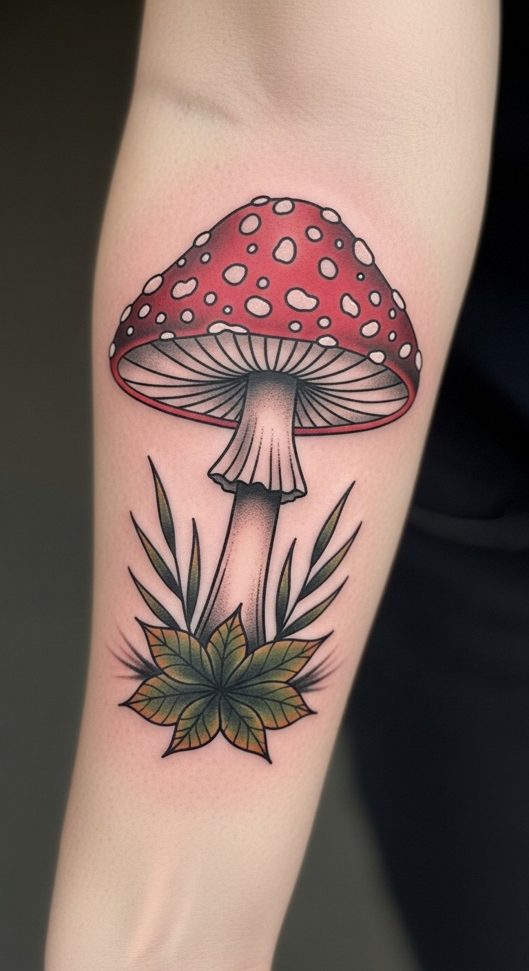The tattoo embodies themes of transformation and magic, drawing on the rich folklore surrounding mushrooms.