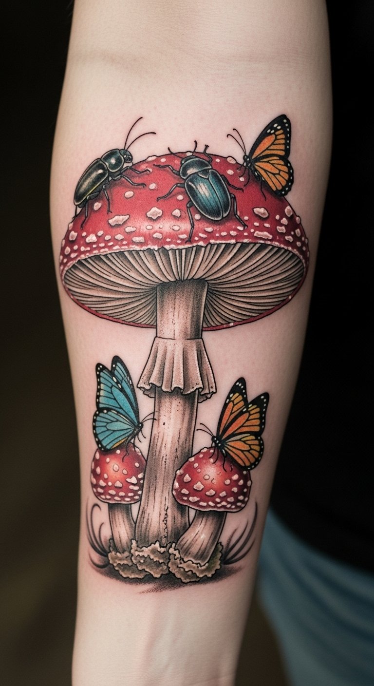 This tattoo symbolizes the interconnectedness of nature, highlighting the relationship between mushrooms and their insect companions.