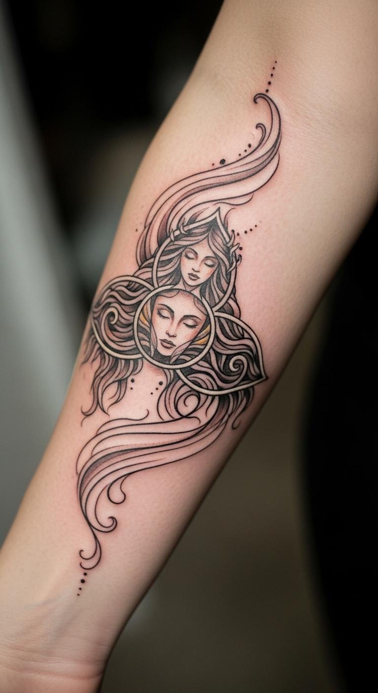 This tattoo represents the powerful journey of feminine energy through life’s phases, celebrating the strength and wisdom inherent in each stage.